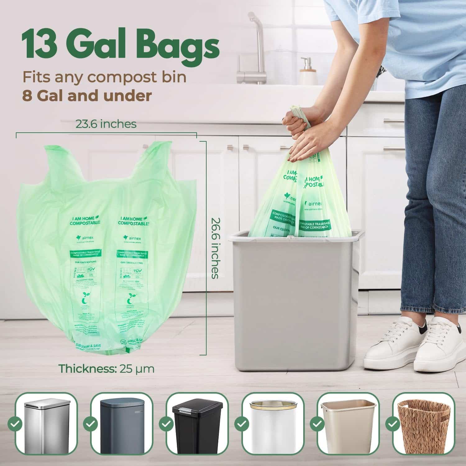 With these biodegradable trash bags 13 gallon size, Airnex continues its commitment to providing eco-essentials for every home. Make a conscious shift from plastic to our compost bin kitchen bags, transforming your daily routine into a sustainable practice.