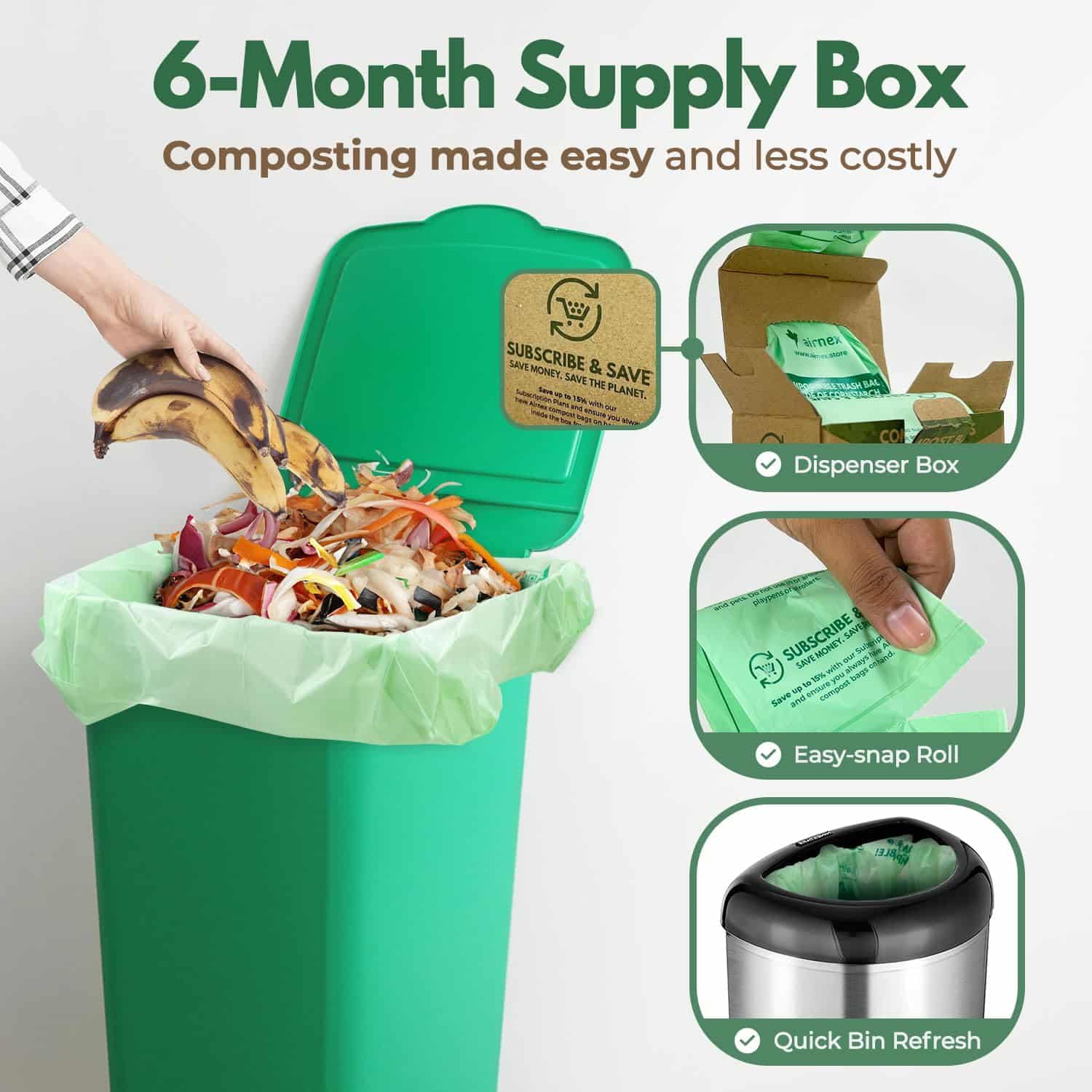 COMPOSTING MADE EASY – Our 100-count 13 gallon trash bags with handle come in a 100% recyclable box that doubles as a compostable bags dispenser. Compatible with any countertop bin that’s 8 Gal or under, keeping them clean with a weekly refresh.