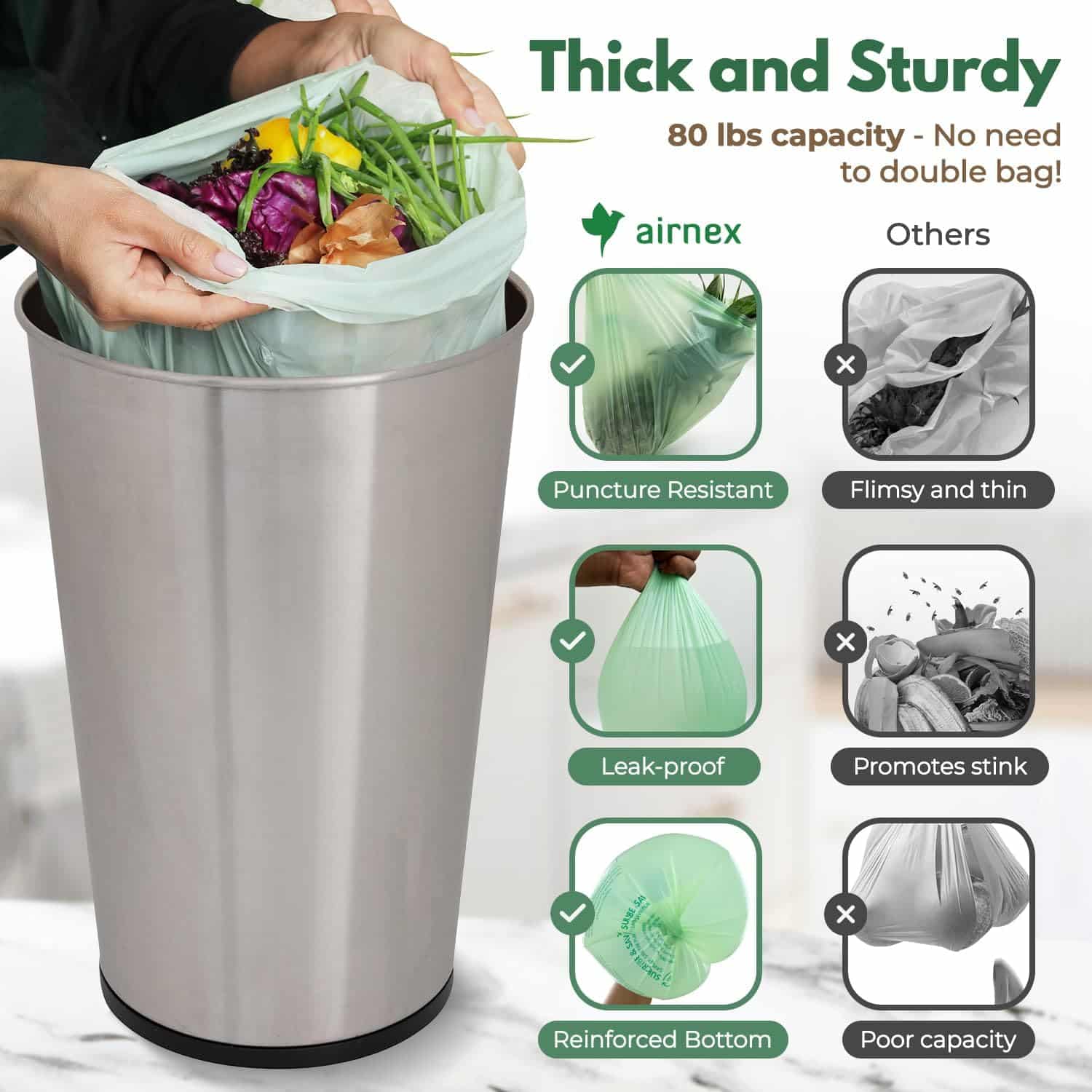CLEAN COMPOSTING, CLEAN COUNTERS – Wave goodbye to stinky bins with our heavy duty kitchen compost bags. With a load capacity of 80 lbs, you can be rest assured that Airnex’s composting bags will hold your food waste without stink, leaks, or tears.