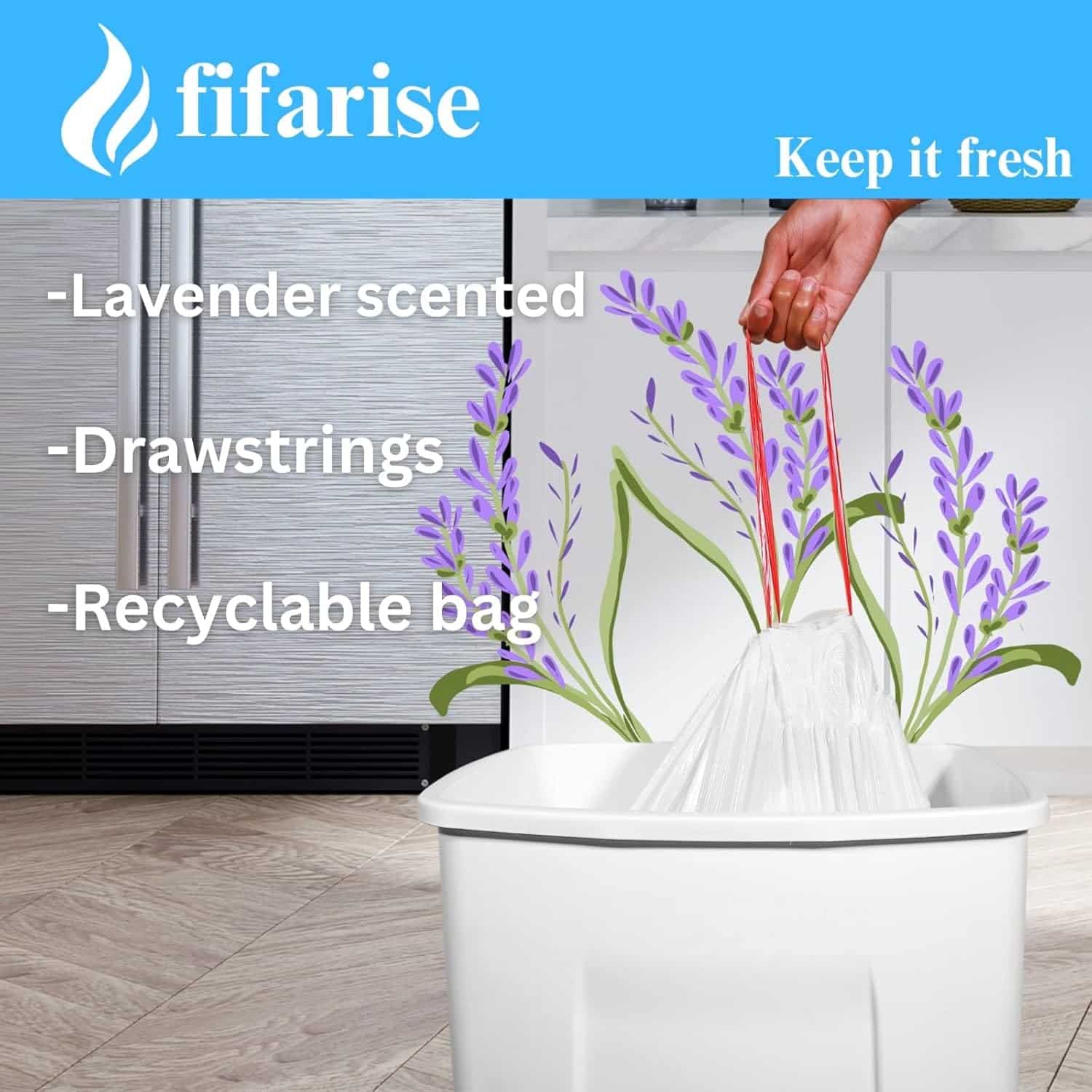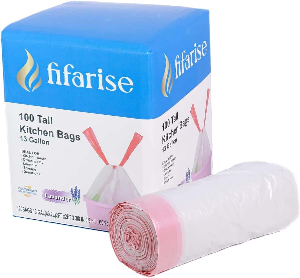 Keep Your Kitchen Fresh with Our Lavender-Scented 13-Gallon Trash Bags! ❤️Capacity: 13 gallons, perfect for standard kitchen trash cans. ❤️Odor Control: Lavender scent helps neutralize unpleasant odors, leaving your kitchen smelling fresh and clean. ❤️Extra Strength: Made with durable materials for superior leak and tear protection. ❤️Drawstring Closure: Easy to use and provides a secure fit, making trash disposal hassle-free. Why Choose Our Lavender-Scented Trash Bags? ❤️Fresh Scent: Enjoy the calming aroma of lavender while keeping your kitchen odor-free. ❤️Durable Design: Strong and reliable, these bags are designed to handle everyday kitchen waste without ripping or leaking. ❤️Convenient: The drawstring closure makes it easy to tie and remove the bag, even when full. ❤️Eco-Conscious: Made with recycled materials, helping reduce your environmental footprint. Package Includes: 100-count pack of 13-gallon lavender-scented trash bags. Product Specifications: Dimensions: 2FT x2FT 3 3/8 IN 0.9 mil (60.9cm x 69.5cm 22.8um) Material: Polyethylene Seal Type: Drawstring