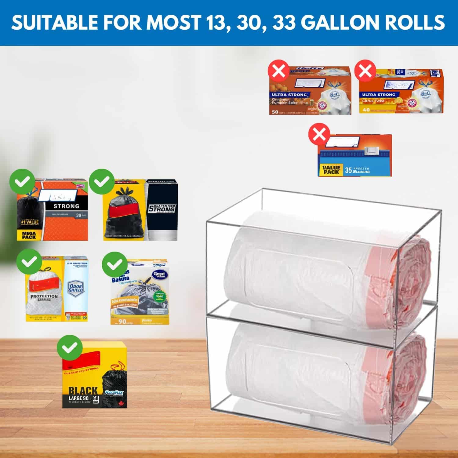 PREMIUM ACRYLIC MATERIAL: Constructed from high-quality acrylic, this acrylic under sink organizers is not only long-lasting but also stylish.Acrylic trash bag holder’s transparent design allows you to easily see when it’s time to refill, ensuring you never run out of trash bags. The premium material of extra large trash bag holder is resistant to everyday wear and tear, providing a sleek and modern addition to any space.