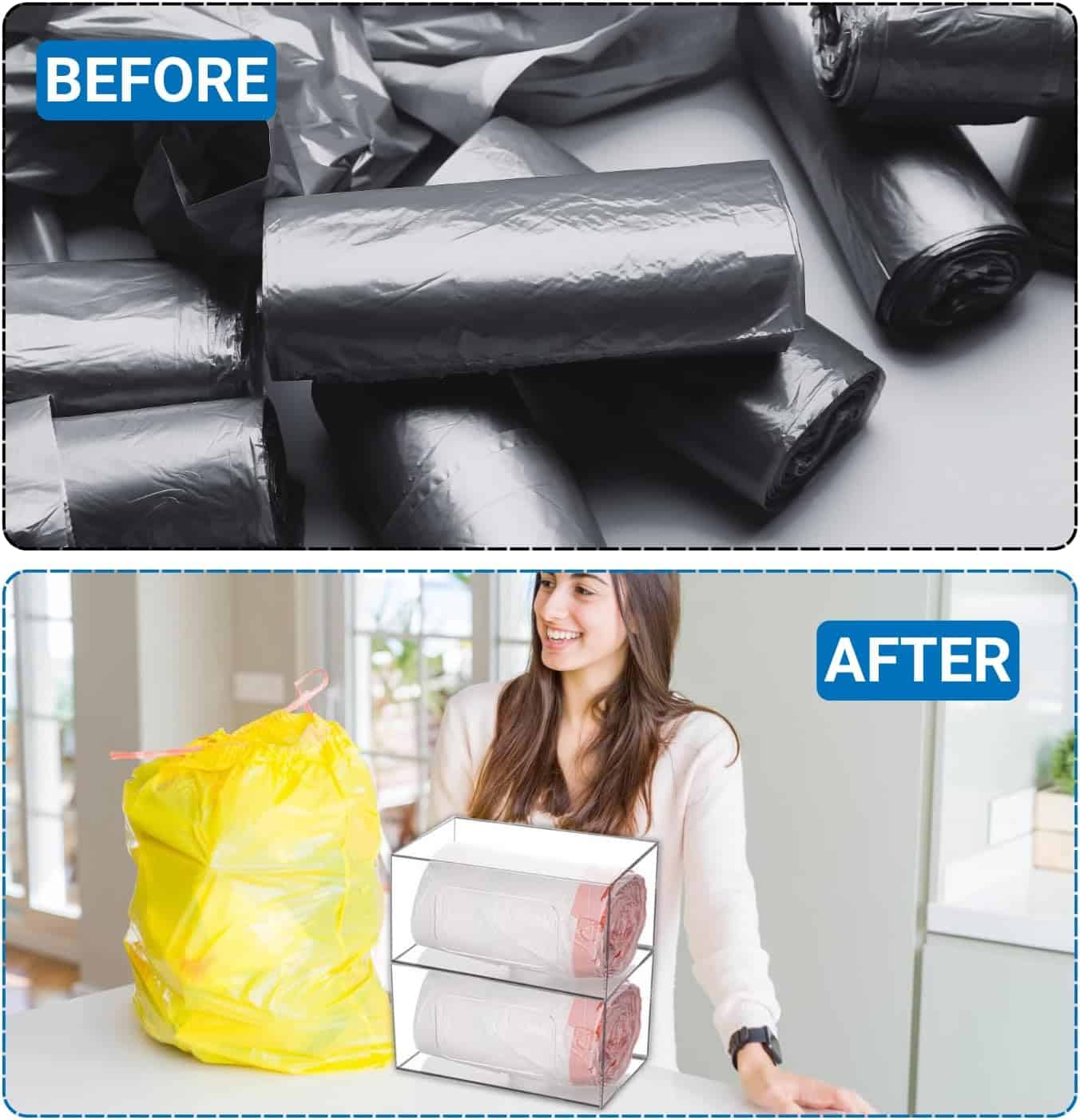 MULTI-SITE USE: Perfect for use in various locations such as kitchens, bathrooms, offices, and workshops. Our acrylic under sink organizer serves as an ideal kitchen trash bag dispenser, seamlessly fitting into any environment. This acrylic dispenser provides organized garbage bag storage and is designed to keep your space clutter-free. Whether you need an under sink garbage solution or a trash can with bag dispenser, this versatile product ensures your trash bags are always within easy reach, offering efficient storage wherever you need it.