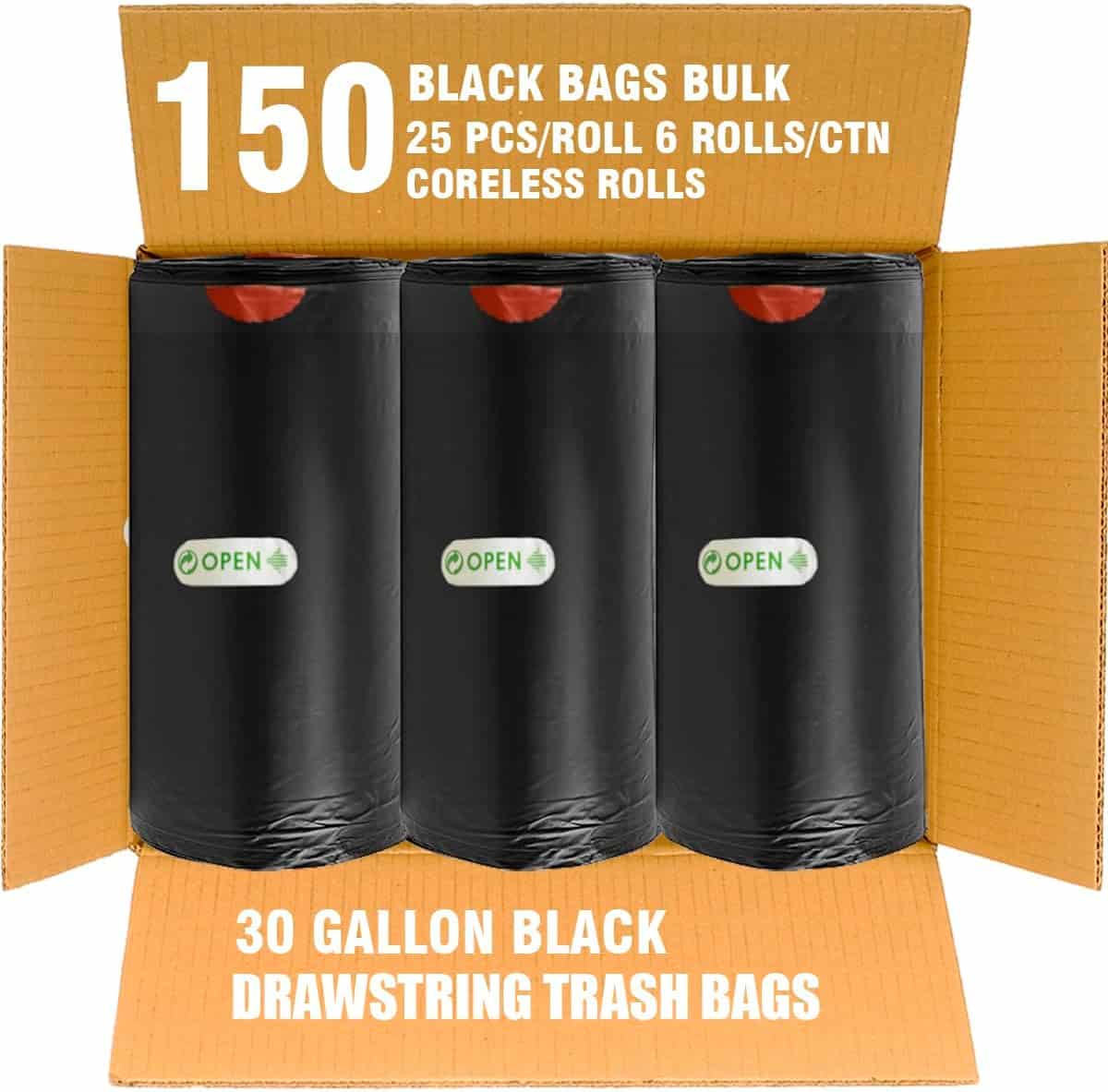 1, Product information: BEIDOU-PAC 30 gallon black drawstring plastic can liners, Size: 30″*33″x 22.9 mic, Total 150 bags bulk (25 PCS/ROLL , 6 CORELESS ROLLS/CTN), Perfect for 30 Gal Capacity Office, Bedroom and Kitchen Wastebasket trash bins.