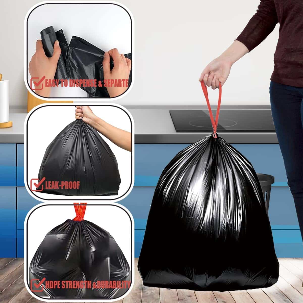 5, Smart Ideas for Your Home:This black drawstring garbage bag is great for use in various settings such as home, kitchen, bathroom, living room, garden, office waste bins, outdoor bins, and more. Black opaque non-transparent bags Bulk Value Bags, Protection of garbage privacy ,with our bulk options, you’ll have plenty of bags for months to come!