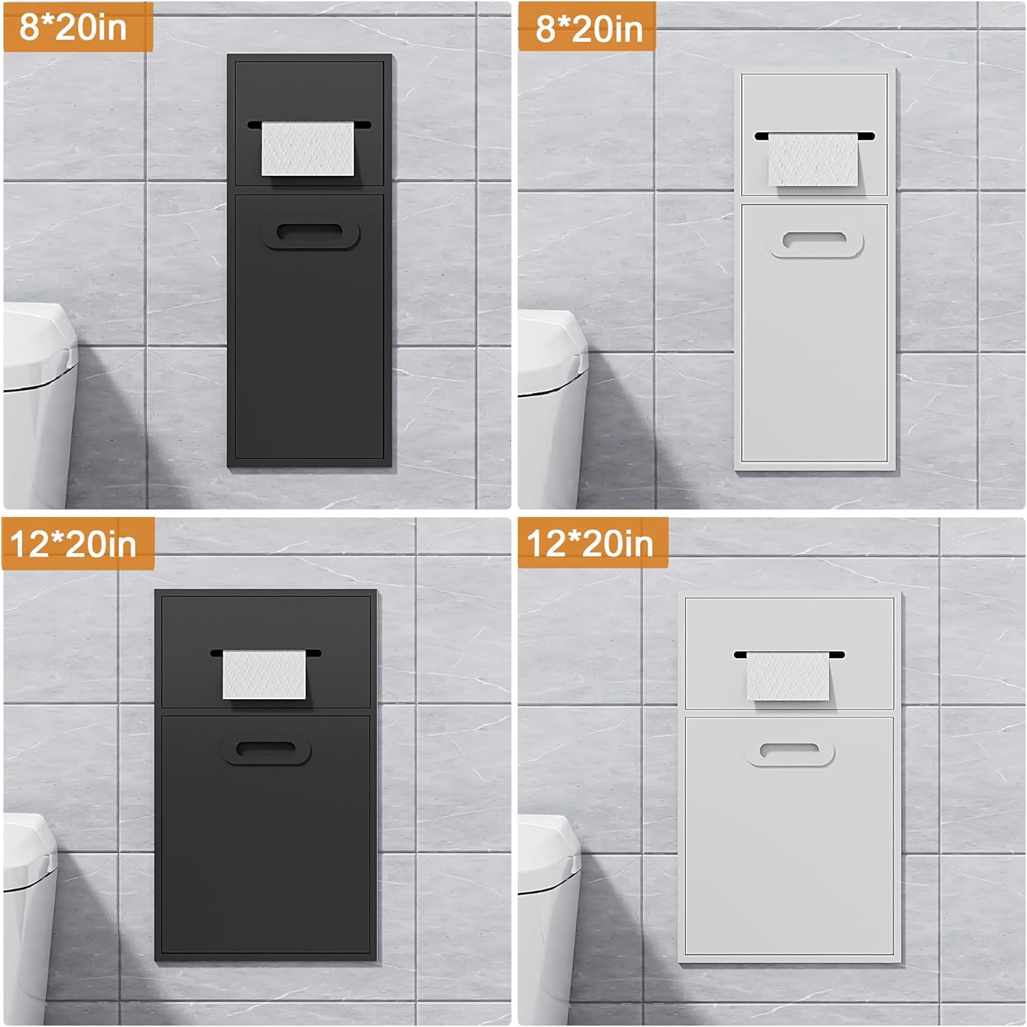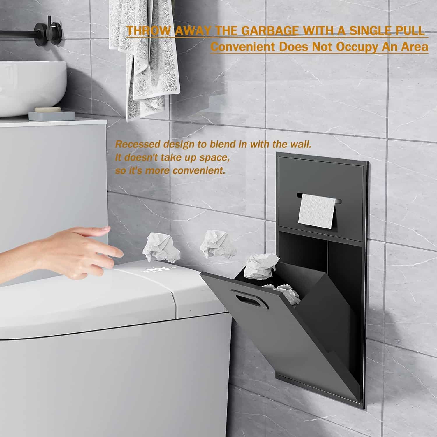 Versatile Storage Solutions: The trash can cabinet recessed design maximizes your bathroom space by providing a dedicated storage area for all your essentials. Organize shampoo bottles, soap dishes, skincare products, razors, and towels with ease. Plus, the innovative addition of a trash can and toilet paper holder transforms this niche into an all-in-one convenience station.