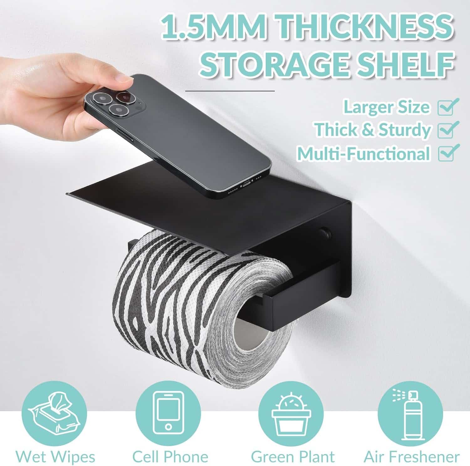 Customers appreciate the toilet paper holder’s sturdy construction, nice appearance, and easy installation. They find it practical and convenient to use, with a large cell phone holder that fits all phone sizes. The storage capacity is also appreciated.