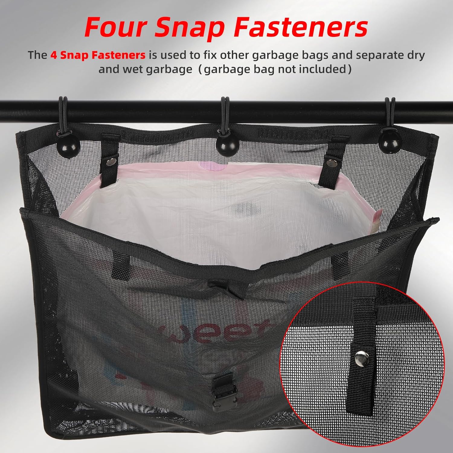 【Easy Installation】 With 3 elastic ropes, the mesh bag can be installed on different types of vehicles with 0.7inches-2.25inches tubes. The 4 Snap Fasteners is used to fix other garbage bags and separate dry and wet garbage(garbage bag not included)