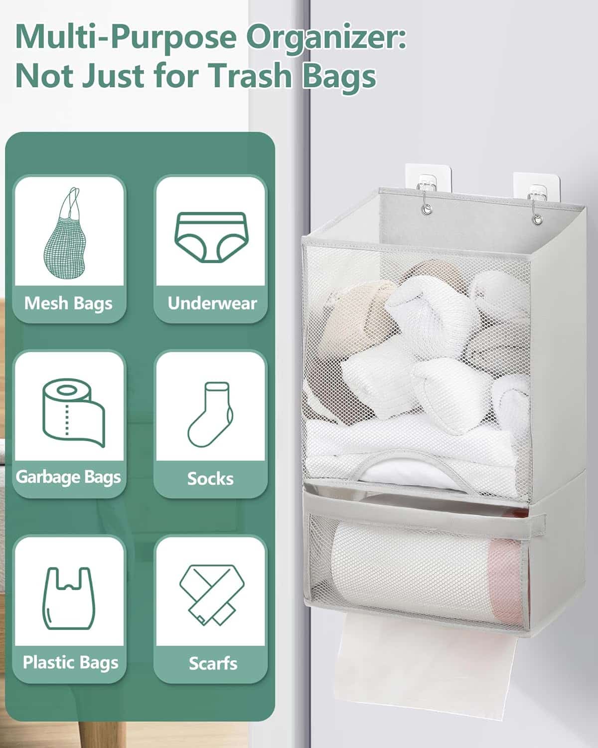 Multifunctional Organizer: Our organizer is not just for plastic bags; it’s also designed to hold a variety of other lightweight household items such as socks, paper towel rolls, and towels, making it a truly multifunctional storage solution.