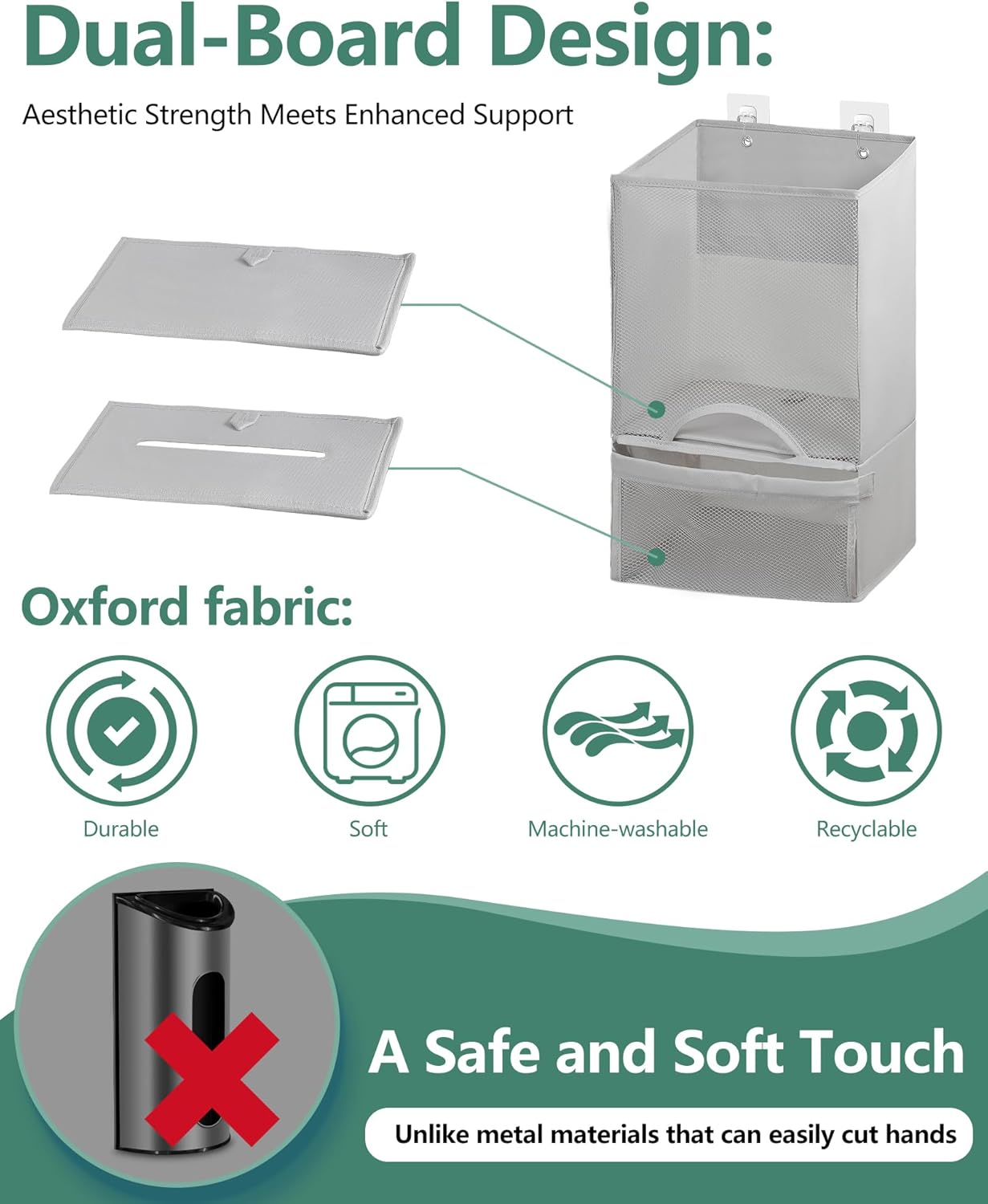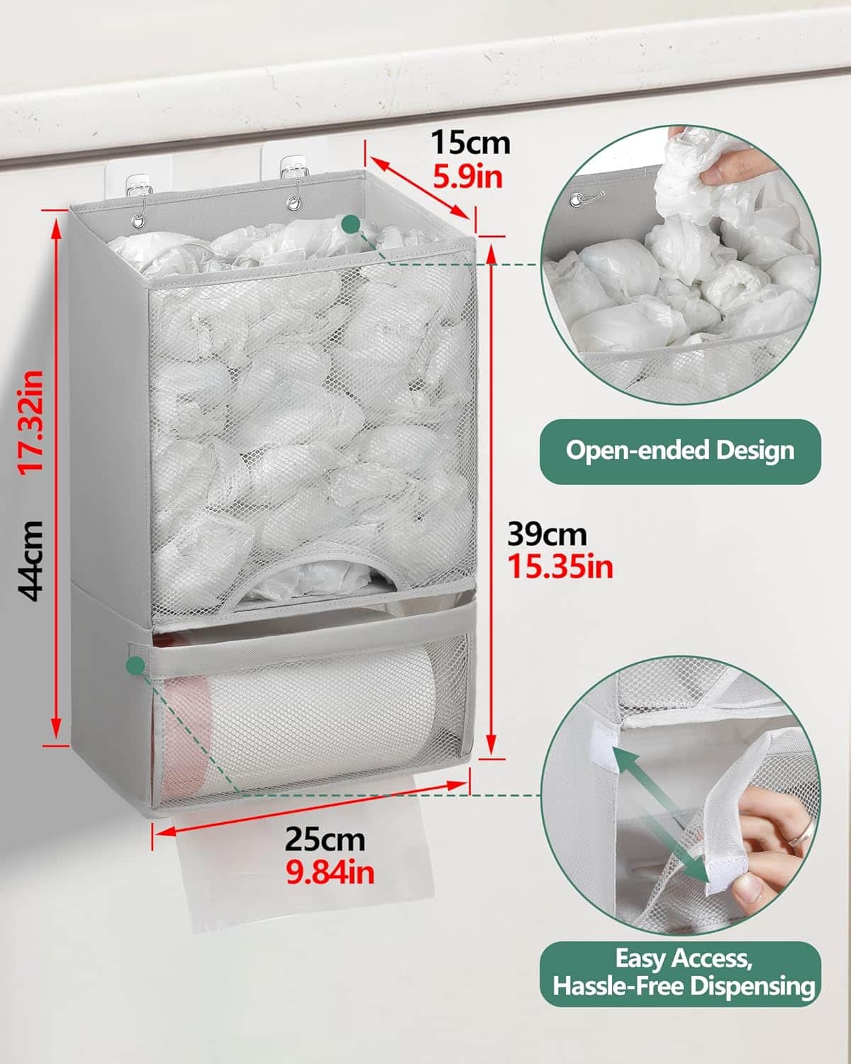 Eco-Friendly Material: Our 2-in-1 trash bag holder dispenser is crafted from durable, gray Oxford cloth that is not only long-lasting but also machine-washable and recyclable. Unlike stainless steel bag holders that can easily cause cuts, our product is made from a very soft material that is safe for you and your family.
