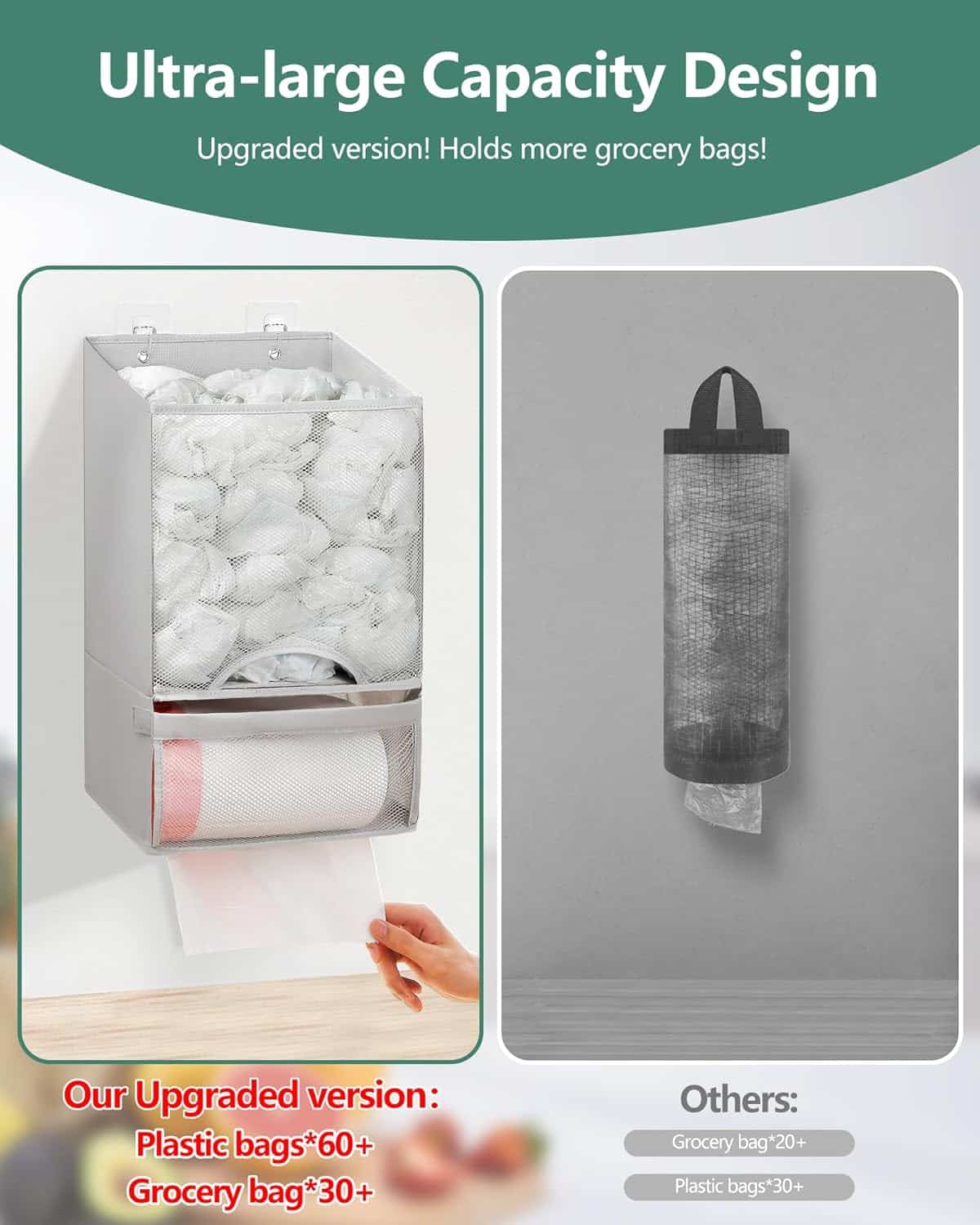 Upgraded Extra Large Capacity: Upgraded the capacity with capable of holding over 60 plastic bags or more than 30 grocery bags easily. The integrated trash bag dispenser has also been enhanced to accommodate a variety of garbage roll sizes, You can even accommodate a trash roll measuring 9.5 inches by 5 inches. Say goodbye to concerns about storage capacity