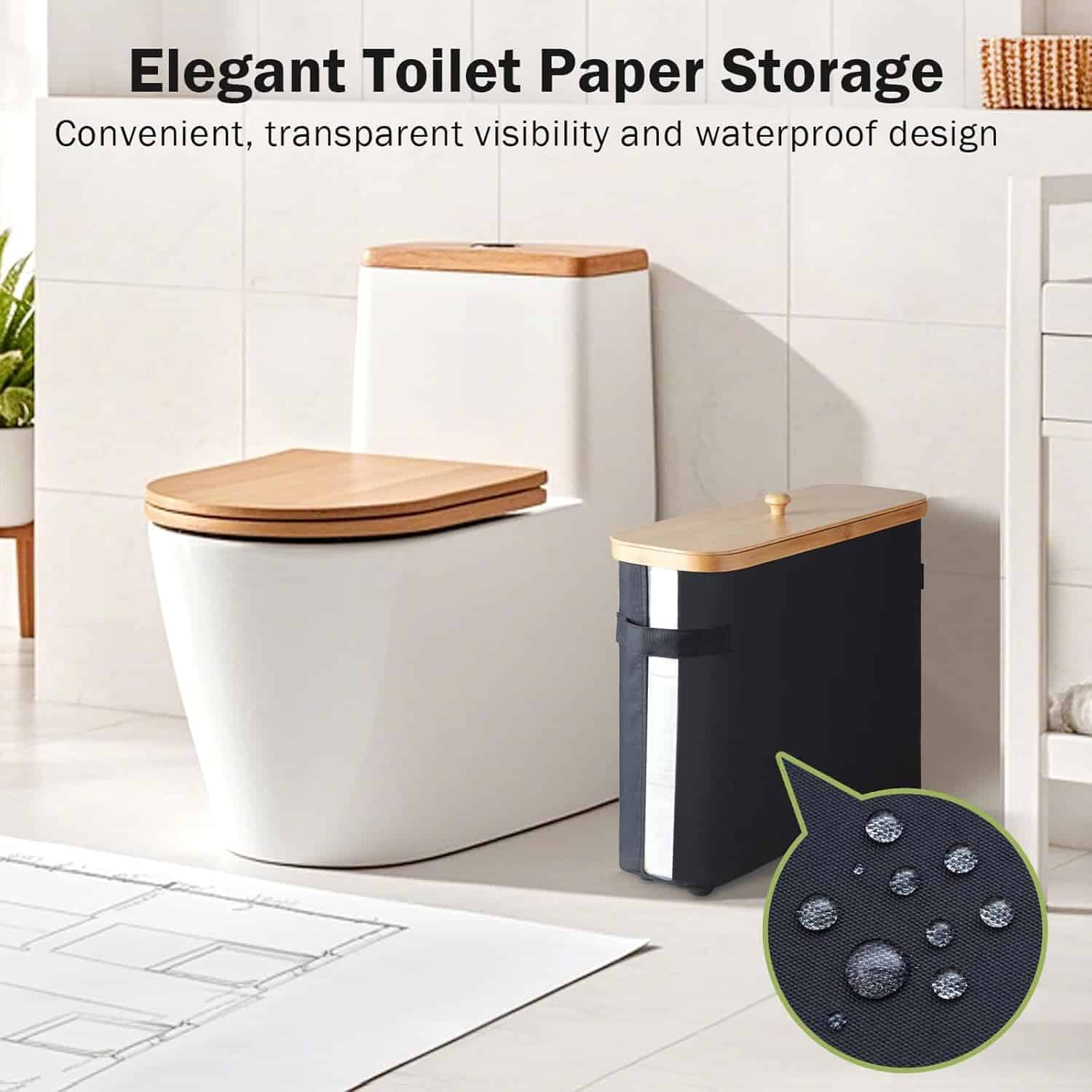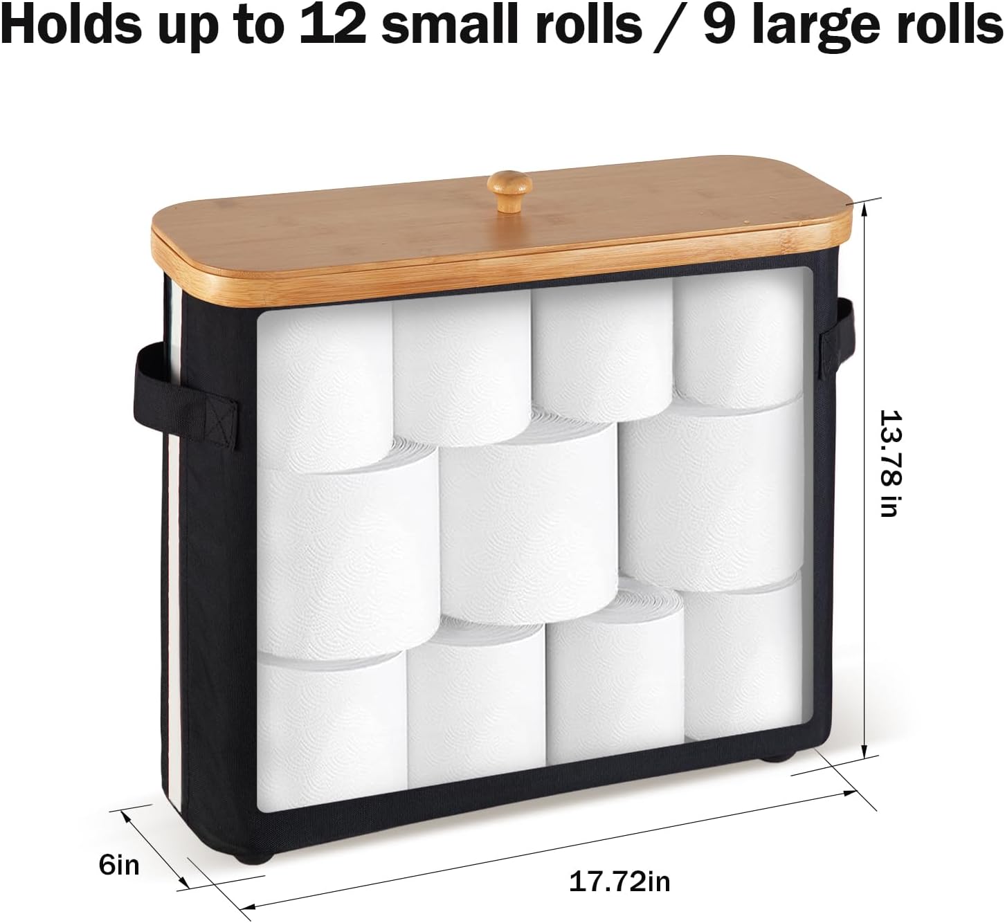 This black toilet paper storage holds 9-12 rolls of toilet paper (depending on roll size).Unique design of see-through window,you can clearly see the toilet paper bin with lid inside the remaining roll of toilet paper,to avoid embarrassing moments.This toilet paper storage bin is tall and narrow, basket for toilet paper material is durable, novelty styles, fashionable appearance,can be placed next to the toilet, restroom, sink, RV, closet, and other tight spaces.The toilet paper basket is made of durable waterproof Oxford fabric and high quality bamboo frame with sealing design all around, moisture and dust resistant.Keep your bathroom accessories organized with this toilet paper storage with lid!