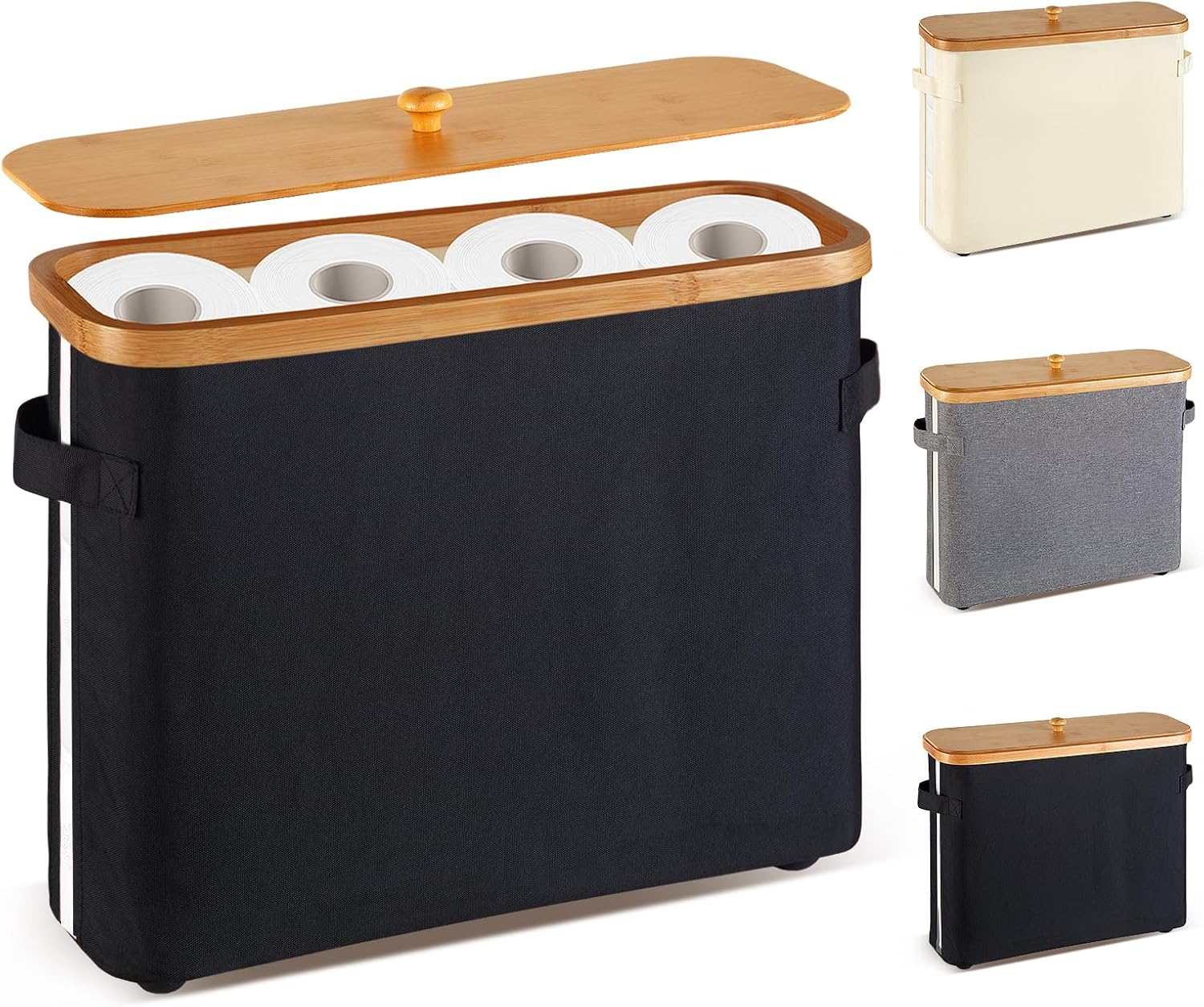 Bamboo Toilet Paper Basket,Bathroom Toilet Paper Storage Basket with Lid and Handle,Extra Toilet Paper Holder, Collapsible Toilet Paper Holder Storage with Non-Slip Bottom ,Toilet Roll Storage,Black
