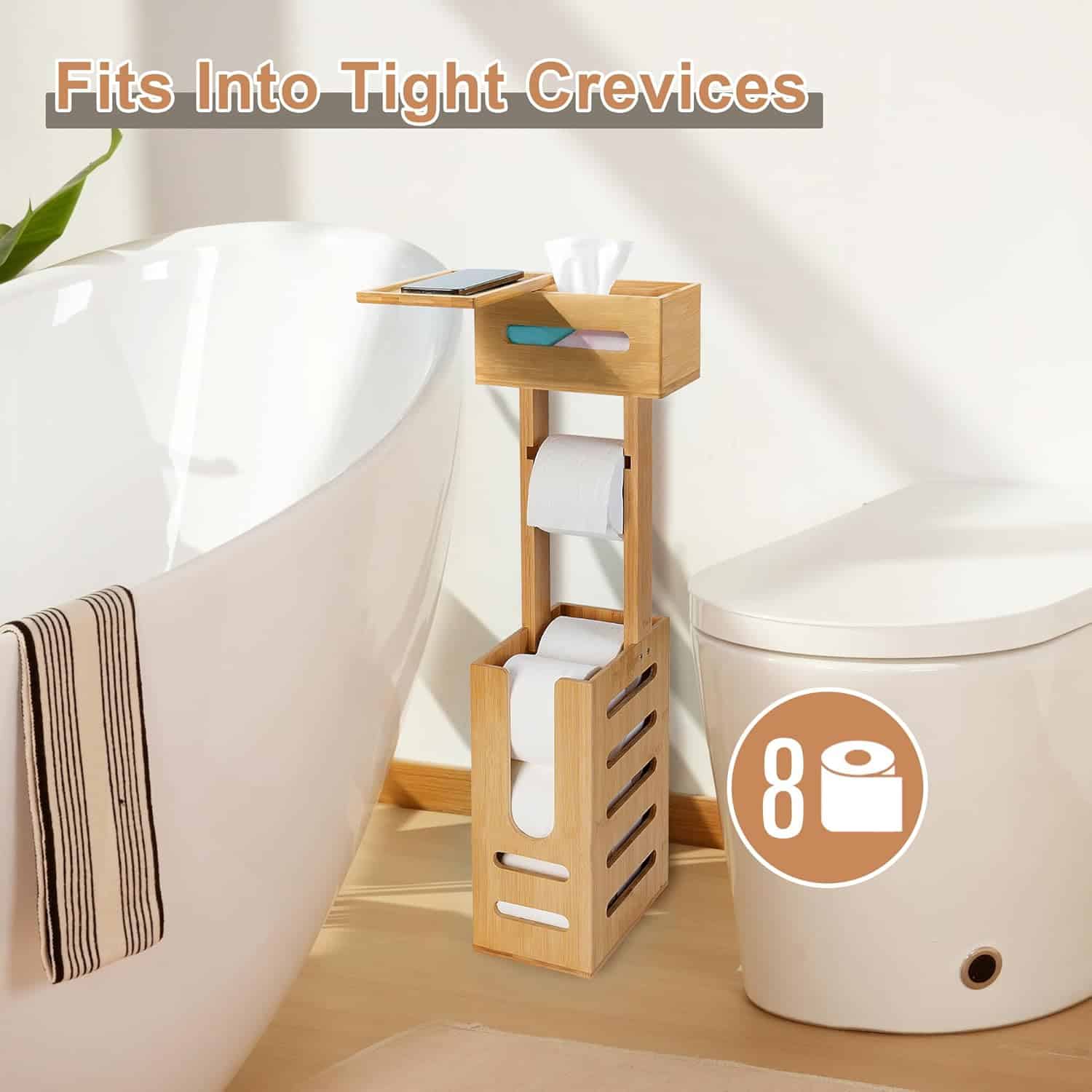 Bamboo Toilet Paper Holder Stand, Stable Free Standing Toilet Paper Holder, Toilet Tissue Roll Holder Stand Rack for Small Space Bathroom and Spare Rolls Storage