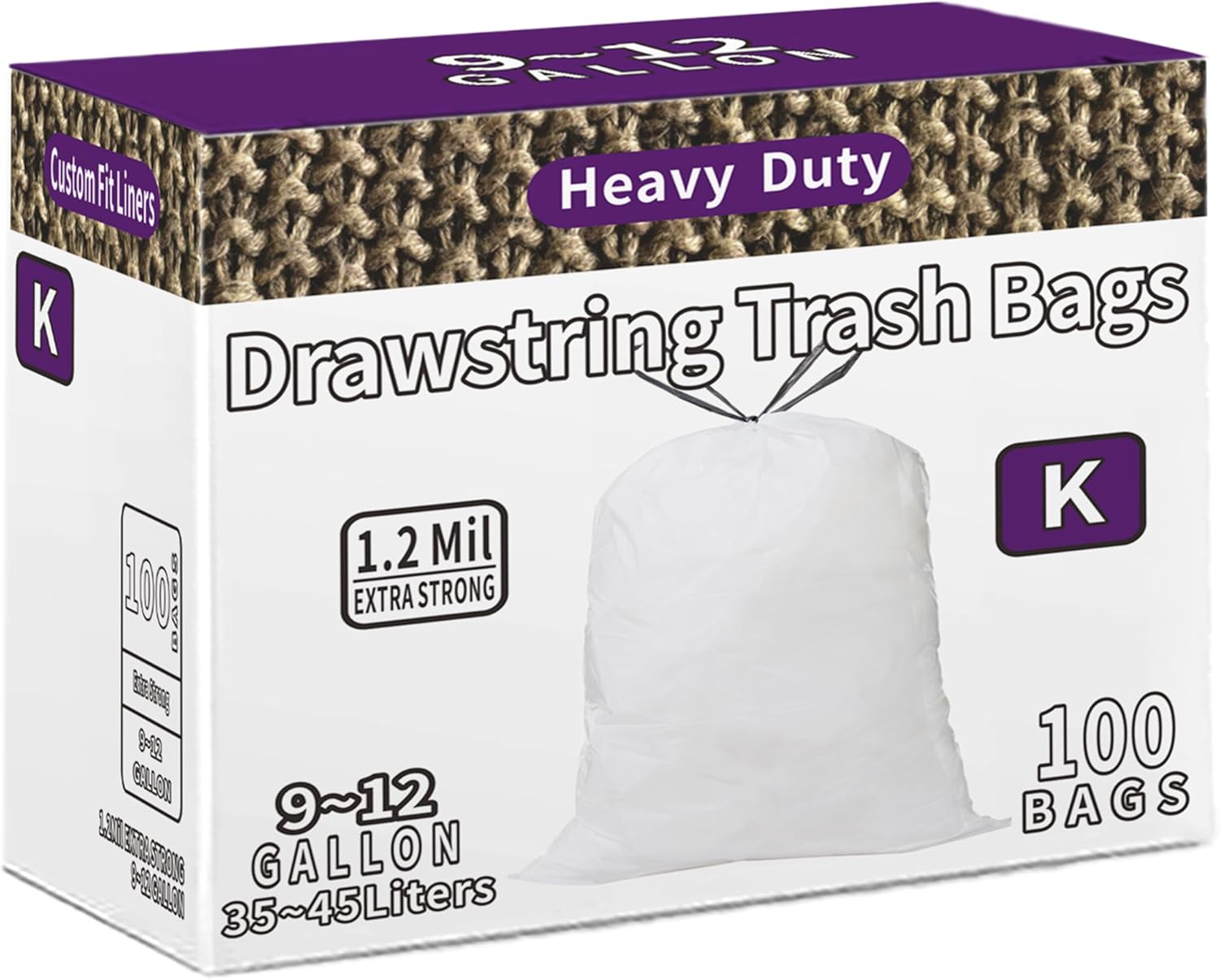 Code K Custom Fit Trash Bags Compatible with Simplehuman Code K | 100 Count | 9-12 Gallon / 35-45 Liter | 1.2 Mil | Heavy Duty White Drawstring Garbage Liners