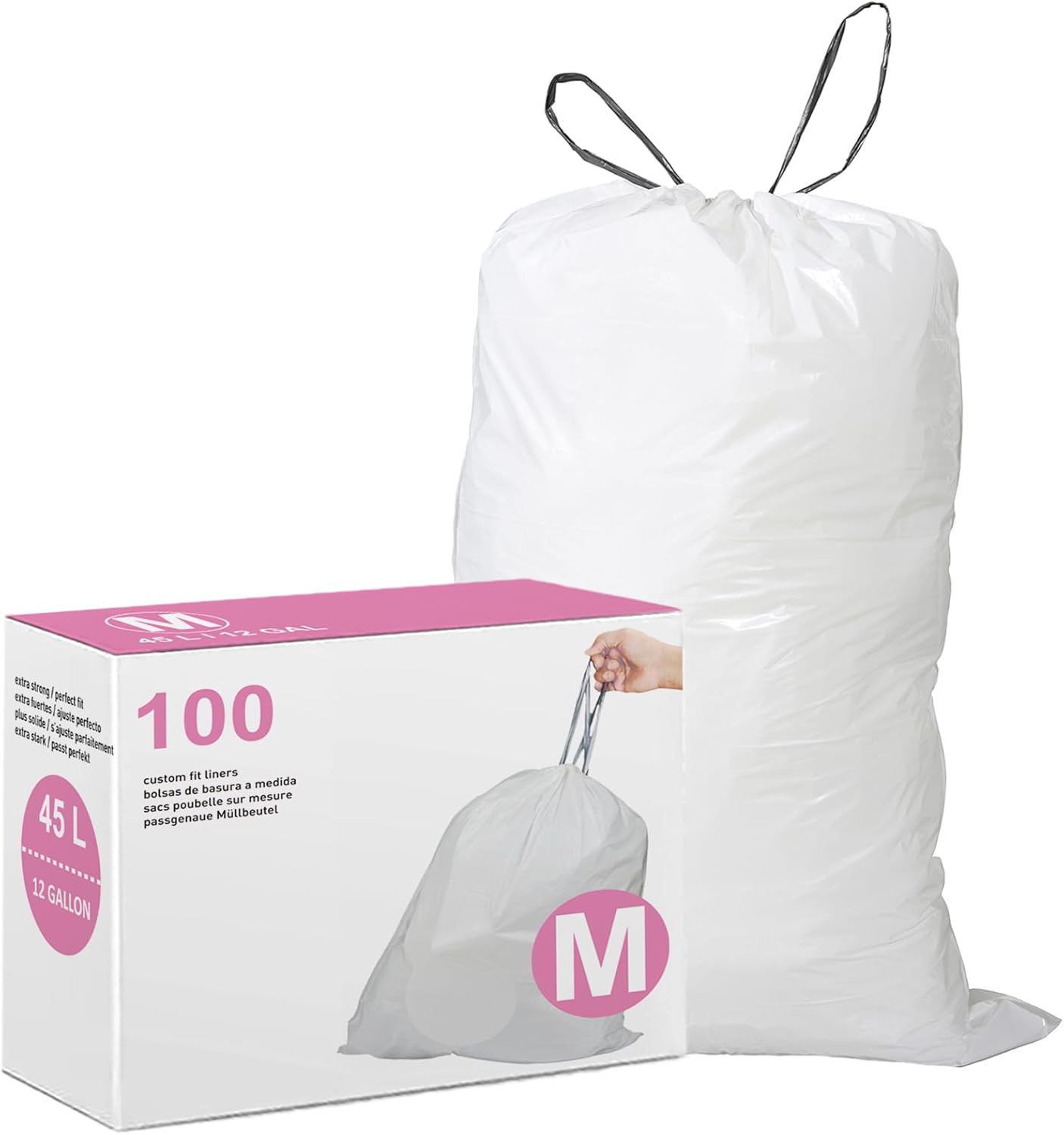 Code M Drawstring Trash Bags Compatible with simplehuman Code M | 12 Gallon 45 Liter | 100 Count | 1.2 Mil | Heavy Duty White Custom Fit Garbage Liners (Pack of 1)