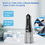 Long-Lasting Rechargeable Battery – This portable water flosser is fitted with a 1500 mAh lithium battery and comes with a Type-C fast charging cable so you can keep it powered up and ready when you’re at home or on the go for up to 30 days of use.