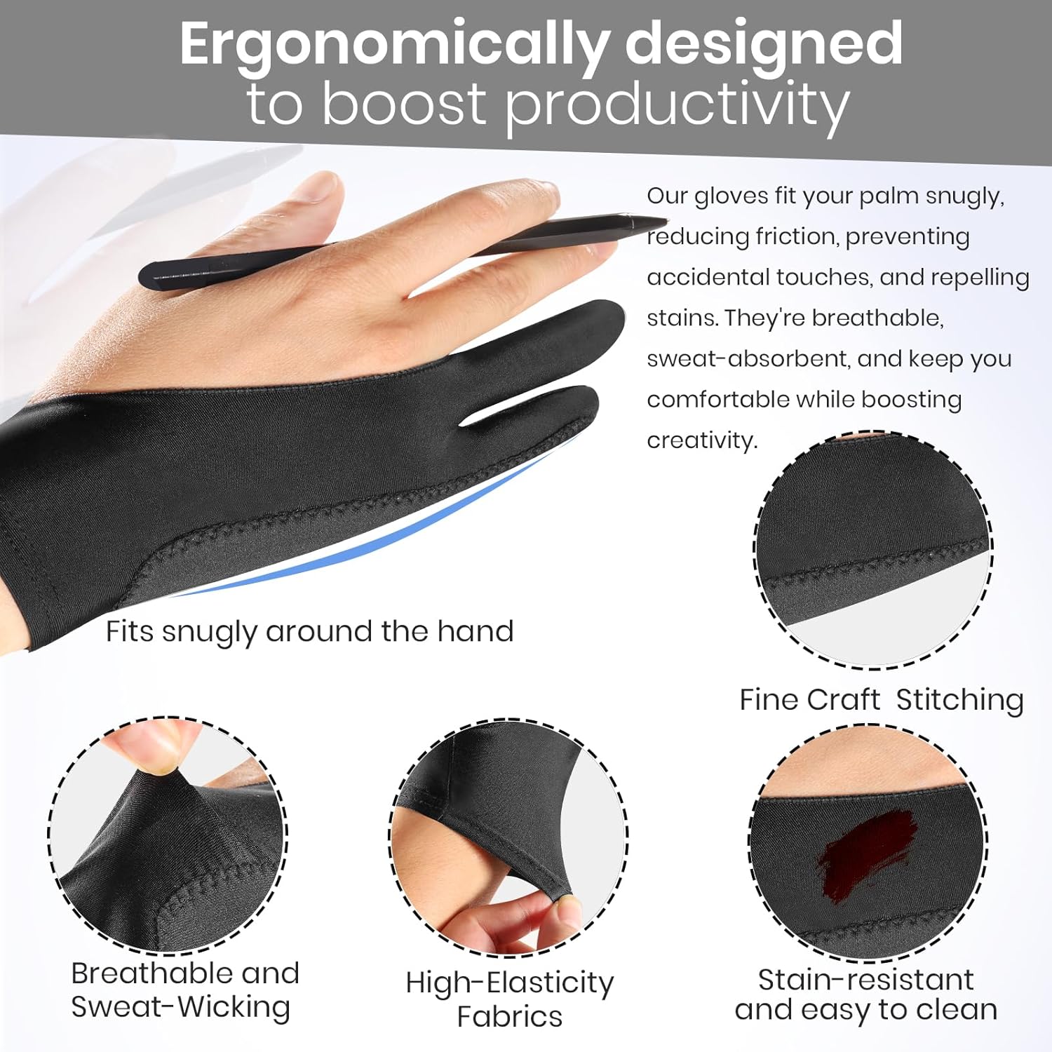 Two Fingers Desgin Fits Both Hands: No matter left- or right-handed, this drawing glove fits snugly on either hand, adapting perfectly to your hand shape Comfortably. The ambidextrous design ensures you can focus on creating without any distractions