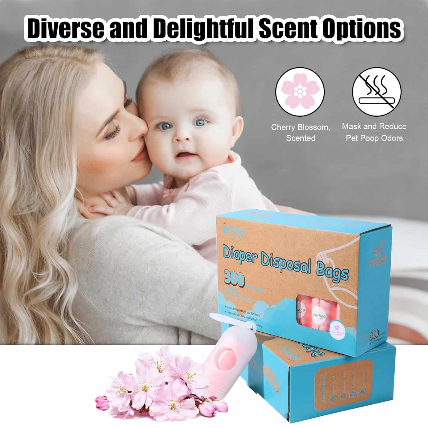 Disposable Diaper Bags for Baby – 20 Refill Rolls (300 Pack), Disposable Trash Bag with Dispenser – Cherry Blossom Scented, Pink, Ideal for Diaper Dispoal