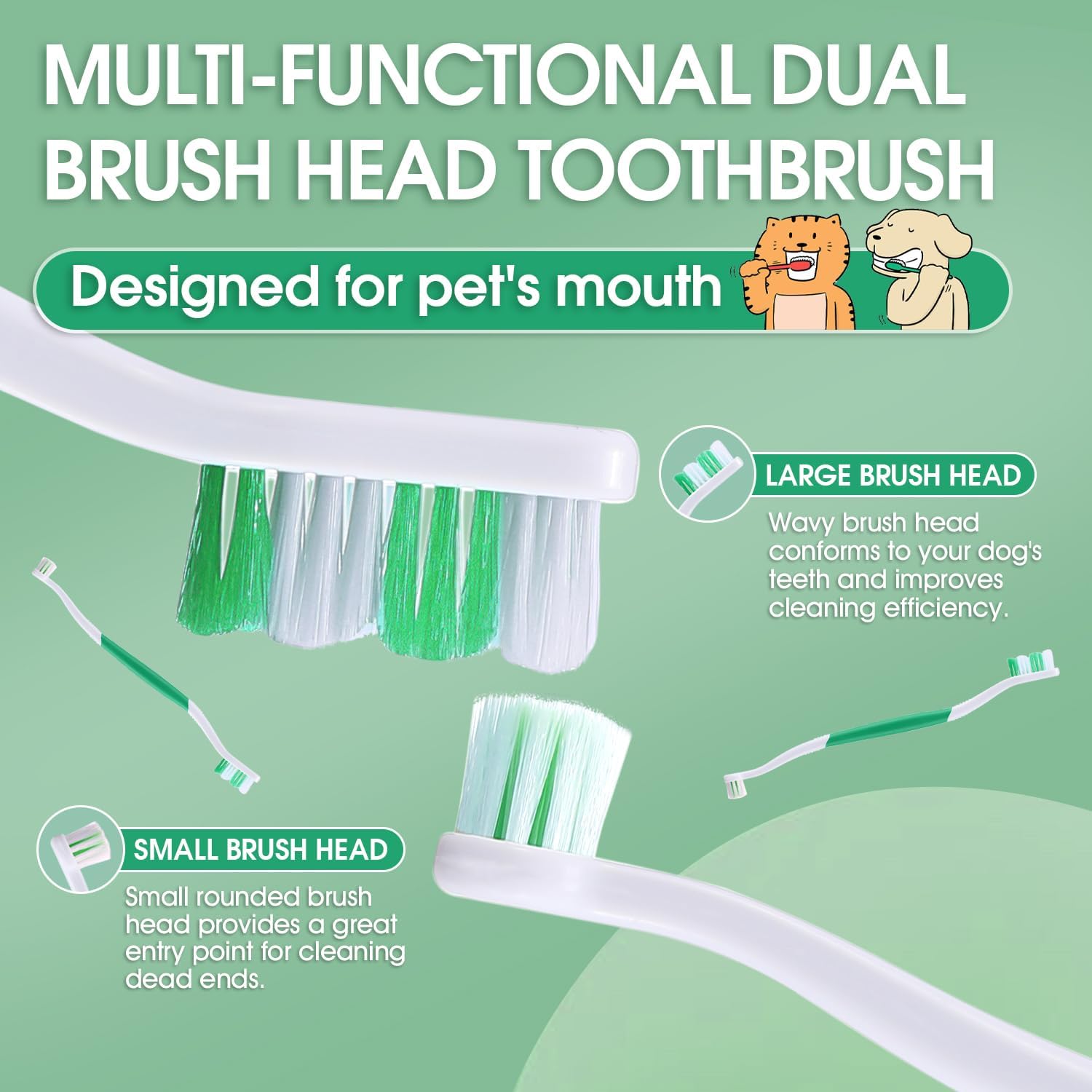 60° Wavy Brush Head: Suitable for large/medium dogs. The double-sided toothbrush with a 60° wavy brush head fits teeth and gum margins, offering 3x more effective cleaning than flat toothbrushes.