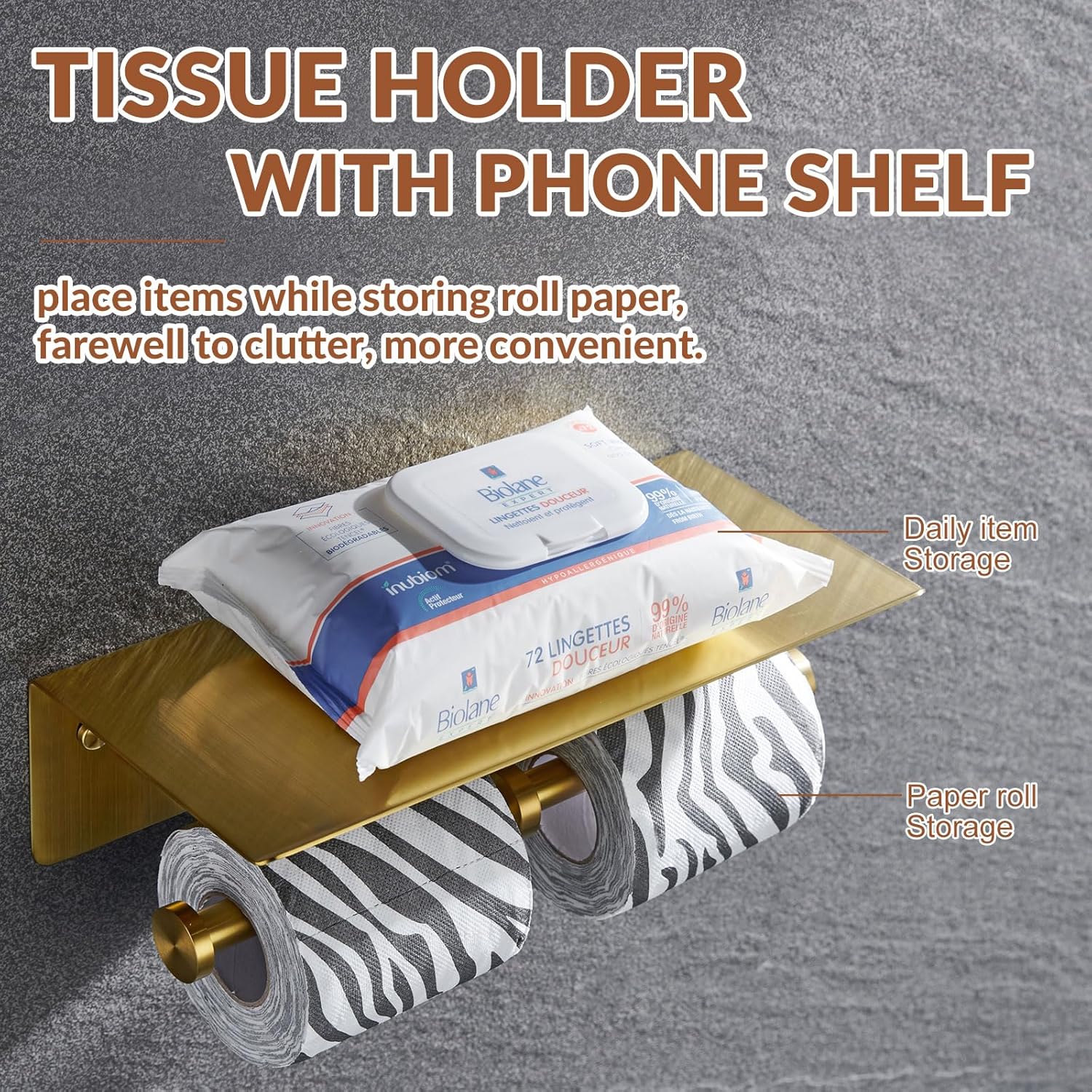 TWO PURPOSE IN ONE ITEM: double toilet paper holder with storage shelf, meet different storage needs. Roll paper and daily items have their own storage area instead of putting down on the floor, keep clean