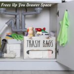 The large trash bag dispenser offers a simple yet ingenious solution to keep your trash bags organized and readily accessible. Trash bag holder dispenser eliminates the hassle of fumbling with rolls of bags, you no longer have to go to your pantry to find trash bags for your kitchen trash container