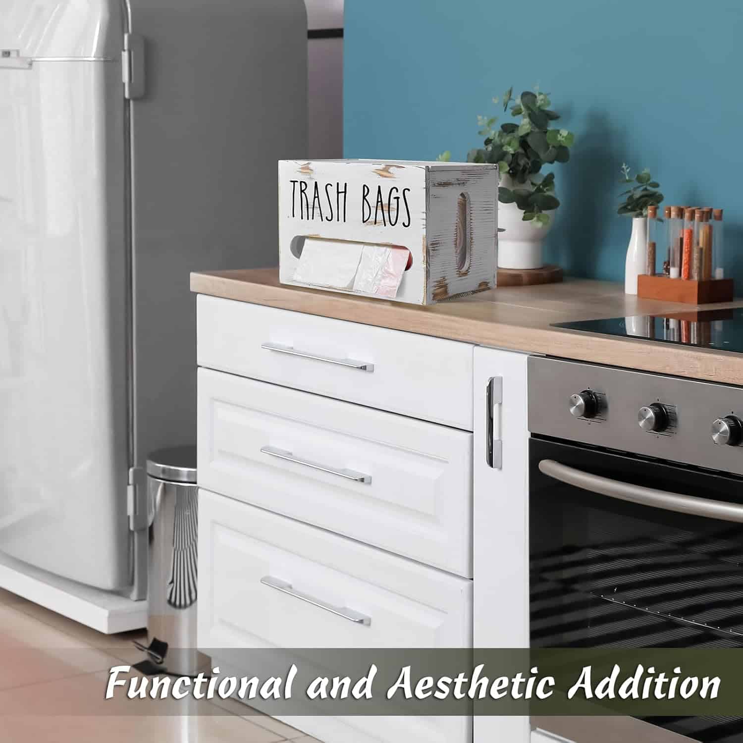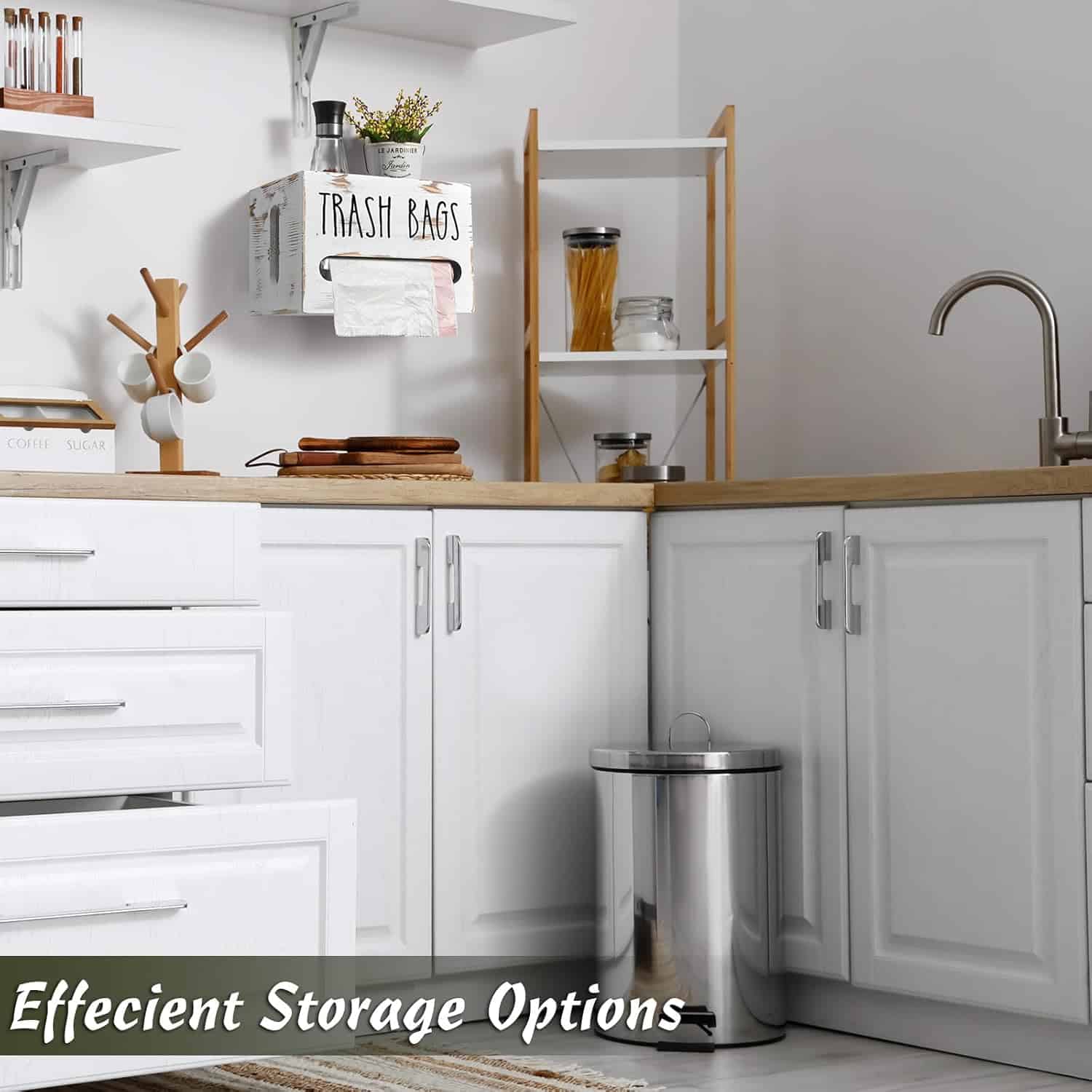 Convenient to Use: The large trash bag dispenser offers a simple yet ingenious solution to keep your trash bags organized and readily accessible. Retro white trash bag holder dispenser eliminates the hassle of fumbling with rolls of bags, you no longer have to go to your pantry to find trash bags for your kitchen trash container