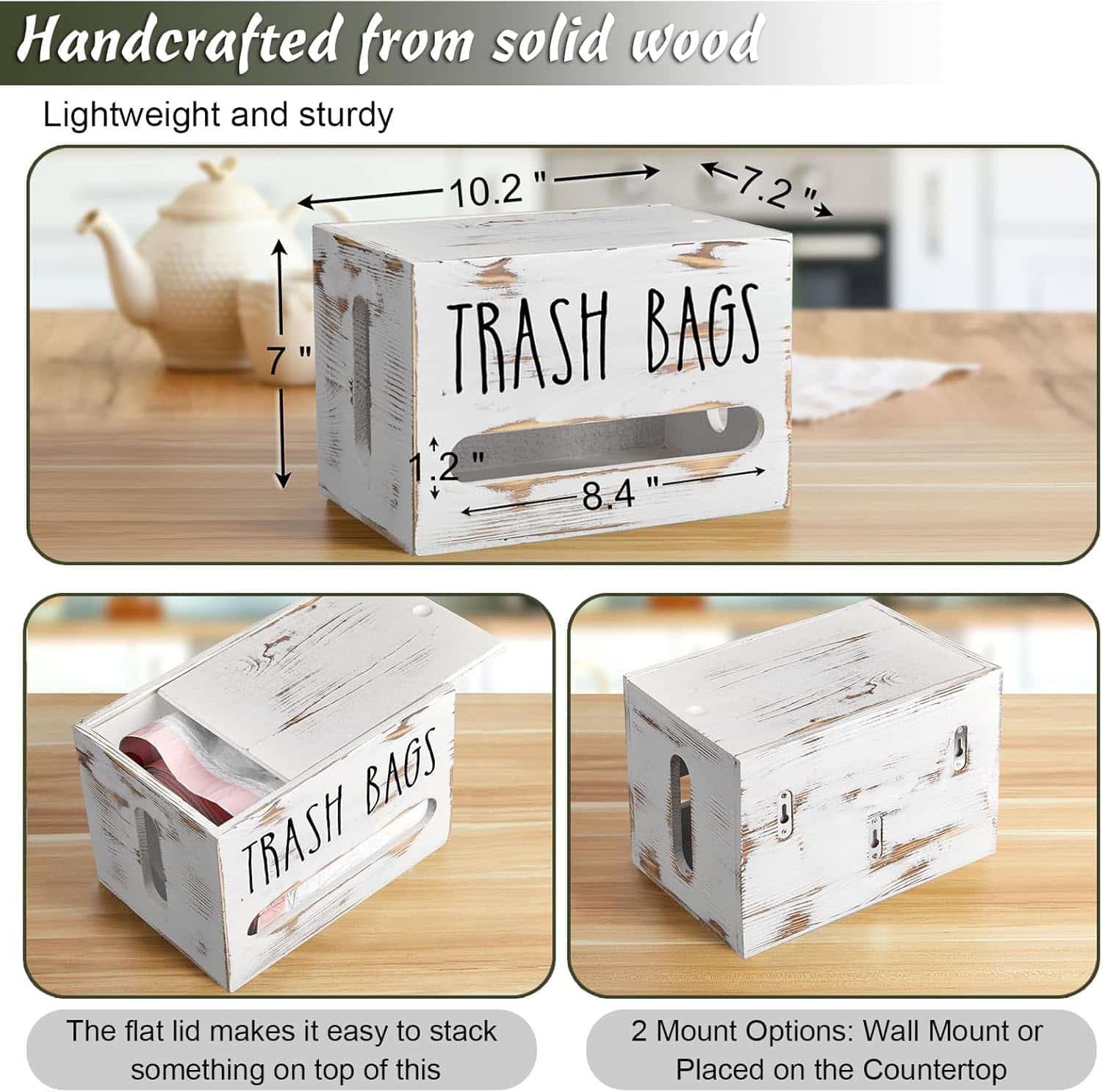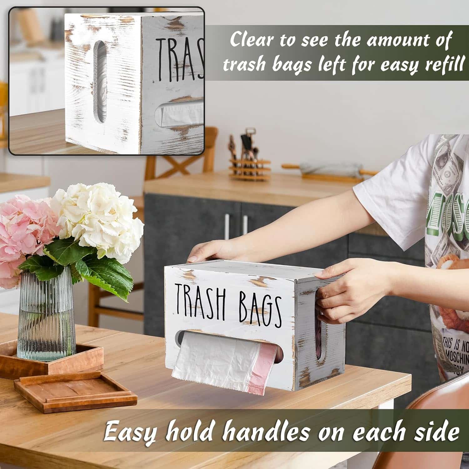 Visualization& Flat Top: The retro white under sink trash bag dispenser with a flat wooden top is sturdy enough to stack more items on top of it. The access is through a slotted sliding panel at the top side. Through the opening on both sides, you can easily know when you should add a new roll of plastic bag
