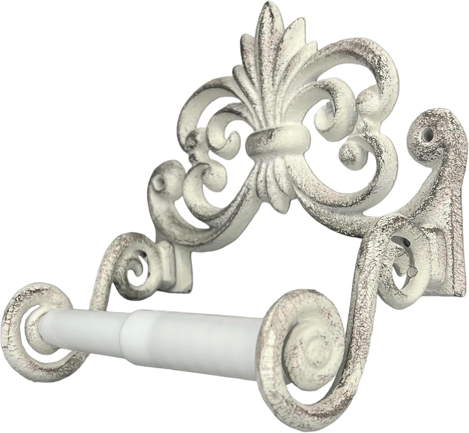 Fleur De Lis Toilet Paper Roll Holder – Vintage Cast Iron Decorative Wall Mount – Distressed Finish with Mounting Hardware (Antique White)