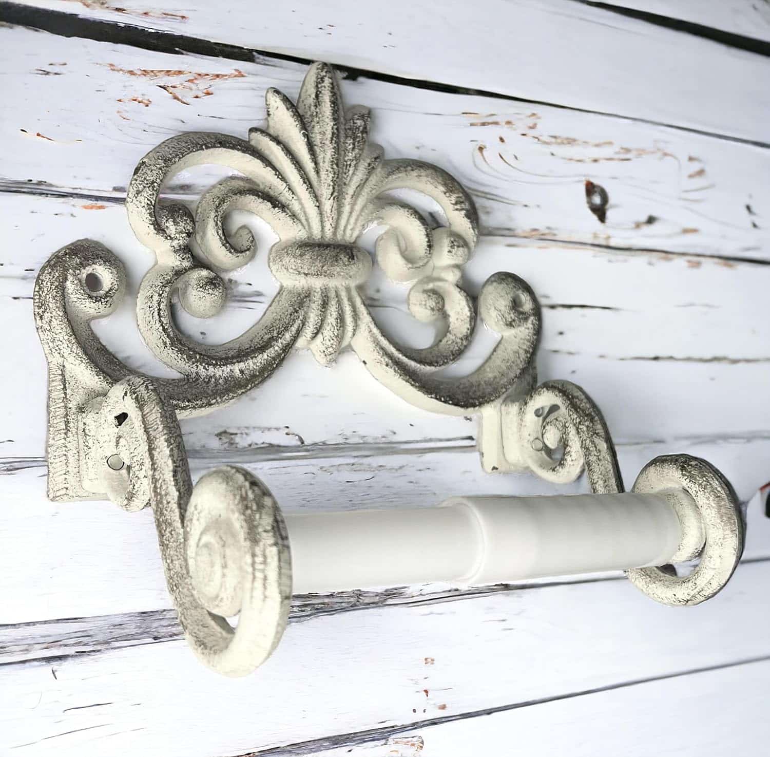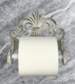 Elevate your bathroom decor with this cast iron, rustic vintage-inspired Fleur de Lis toilet paper holder, featuring a beautifully distressed finish that adds a touch of elegance and old-world charm. This substantial piece weighs over 1 1/2 pounds, ensuring durability and stability. Designed to accommodate standard, double, and mega rolls, it combines functionality with style. The holder comes complete with mounting hardware for easy installation and features a spring-loaded roll holder for effortless roll changes. Its dimensions, 7 1/4” wide x 6 3/4” tall x 4” deep, make it a versatile fit for any bathroom space.