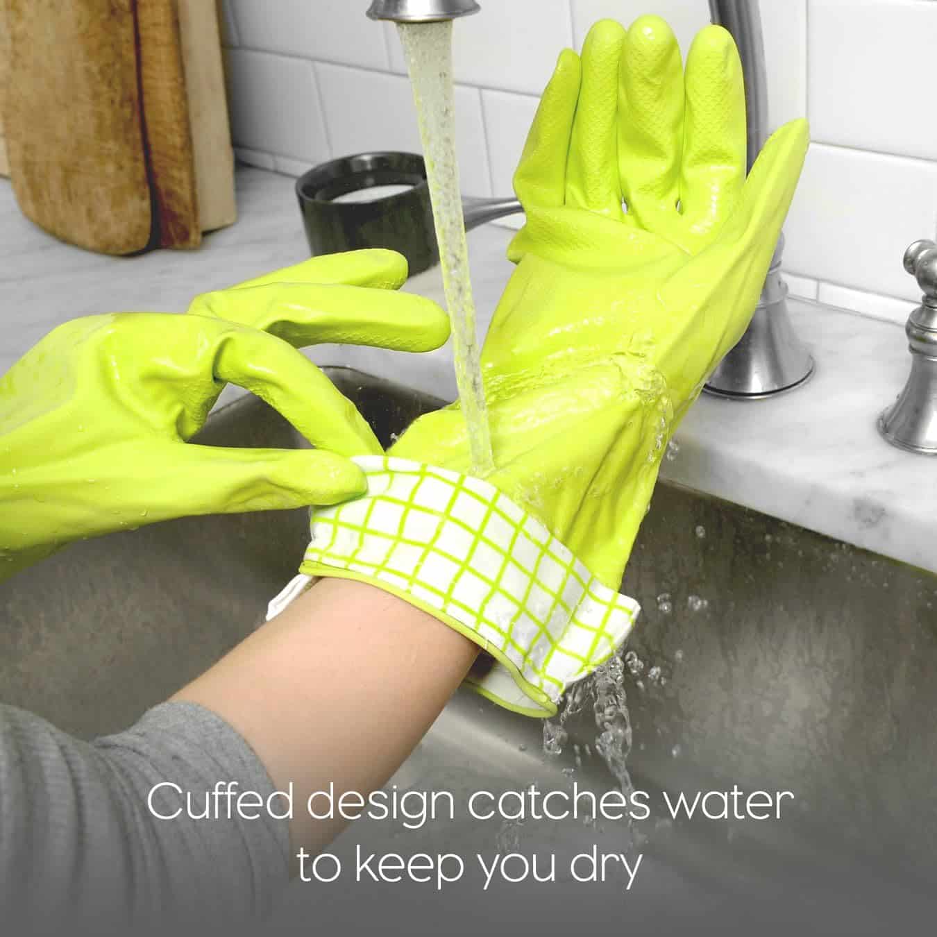 Natural latex cleaning and dish gloves are durable with a slip-resistant grip