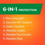 6 IN 1 PROTECTION—These flexible trash bags offer a powerful combination of six features that keep garbage where it belongs: flex strength, tough drawstring, patented odor control, resistance to leaks, puncture protection, and rip defense