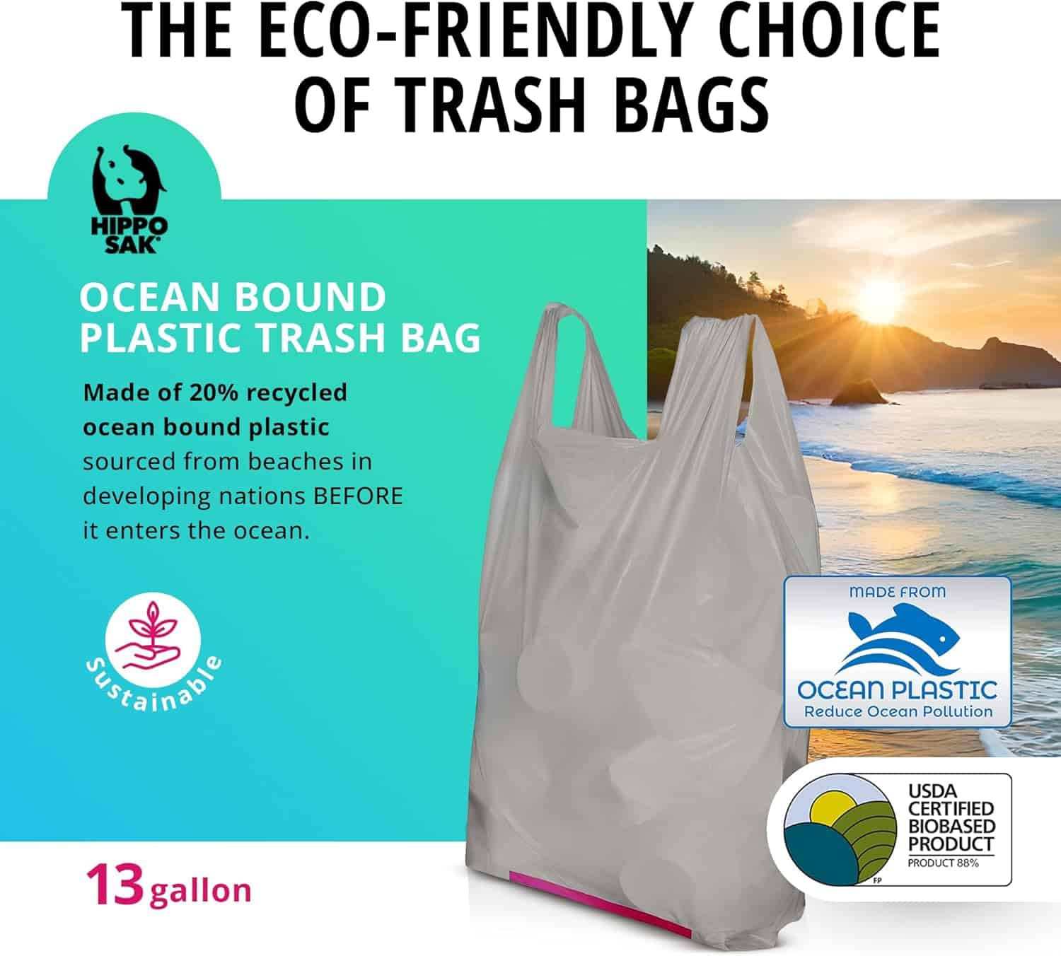 Keep our oceans and your kitchen clean! Made from recycled ocean bound plastic, Hippo Sak 13 gallon trash bags are a sustainable solution to traditional plastic garbage bags, ensuring clean oceans and marine life.