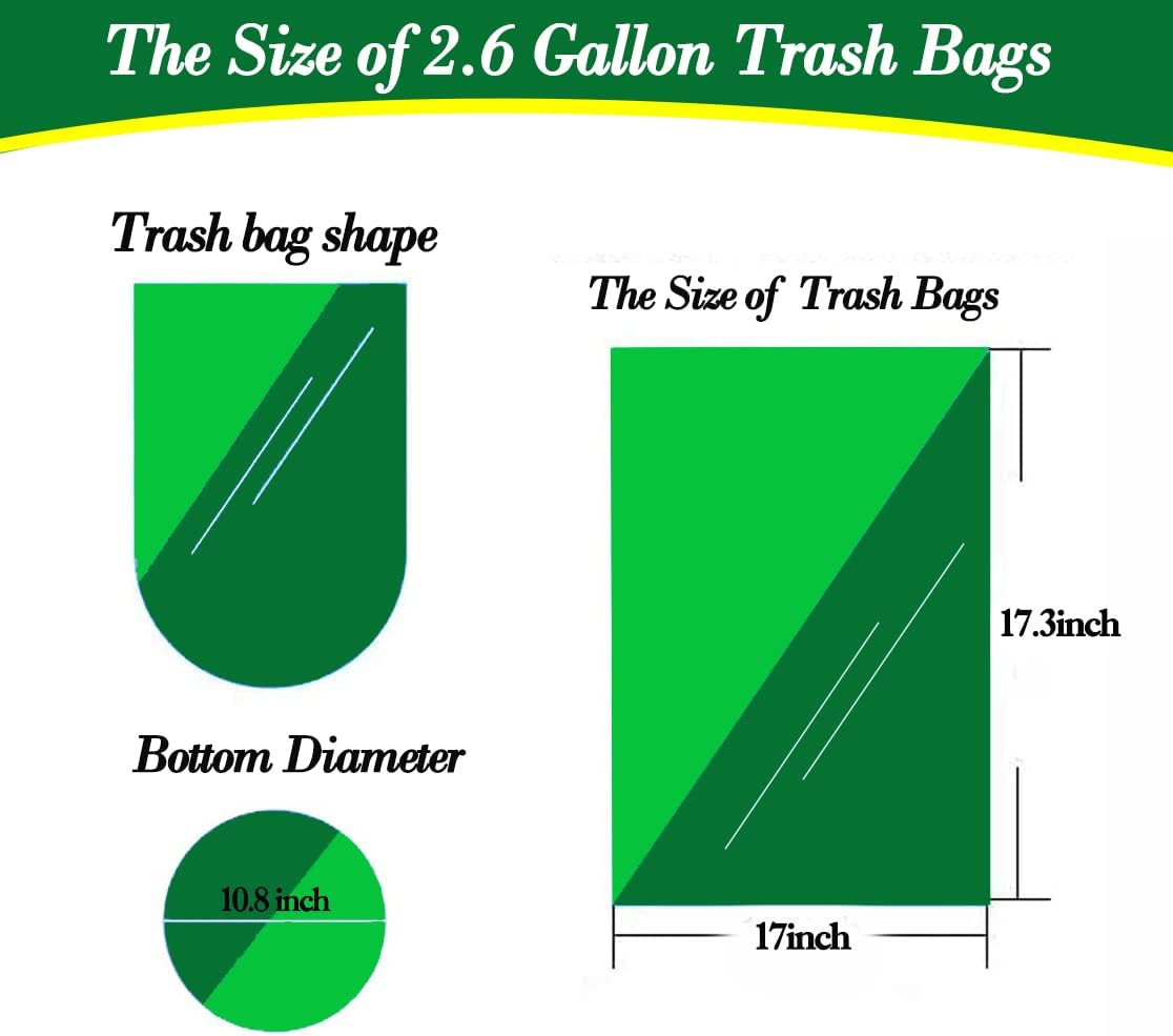 ✔【Nice Fit】 These 2.6 gallon trash bags are the nice fit for 6-10 liter waste bins. This means they fit for 2,2.1,2.2,2.4,2.5,2.6 gal trash cans. They are mini in size, making them ideal for use in small spaces such as bathrooms or offices.