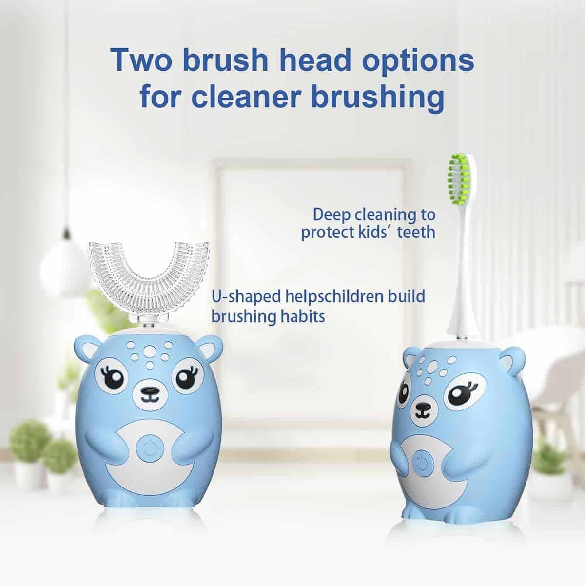 WHAT YOU GET : Kids electric toothbrush body, 2 U-shape brush head, 2 soft brush heads, USB cable, Dustproof Gargle cup(toothbrush cover), User manual