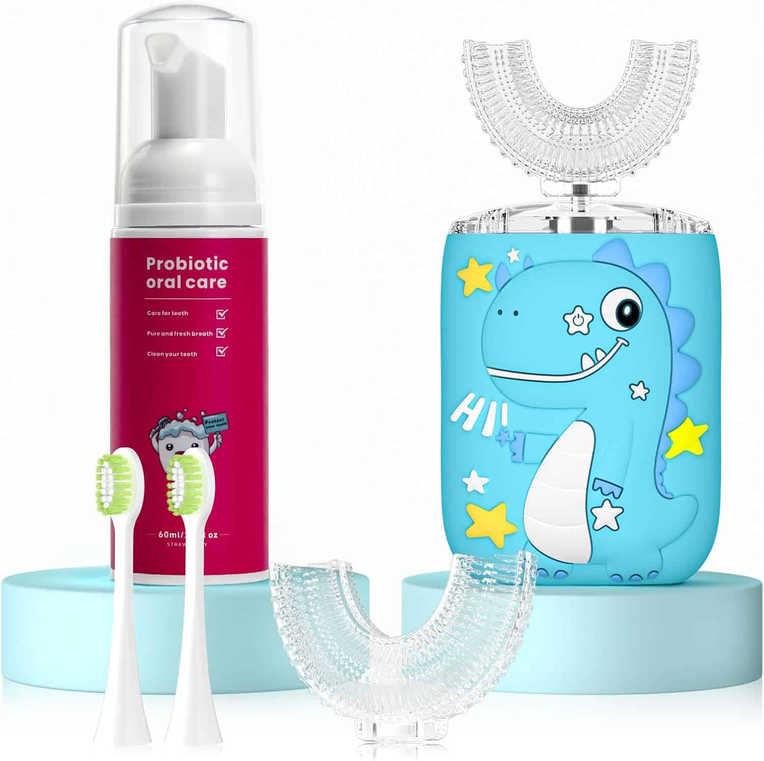 More Brush Heads and Toothpaste: The u-shaped toothbrush with 2 replaceable normal brush heads and 2 u-shaped brush heads. We also have strawberry flavored foaming toothpaste that will make your kids love brushing