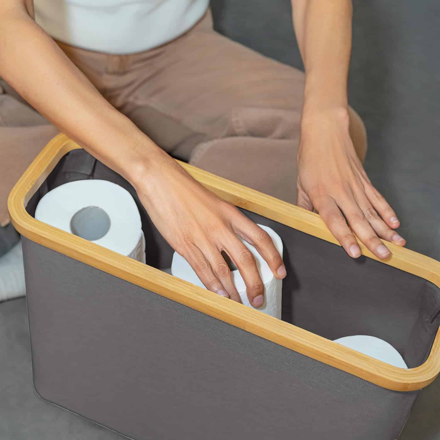 【Bamboo Materials】Our Toilet Paper Basket is made with high-quality breathable materials that keep homes smelling good. The wooden parts of the bathroom organizer is made with bamboo. This storage basket offers an elegant look for your bathroom or utility closet. Available in 4 different colors!