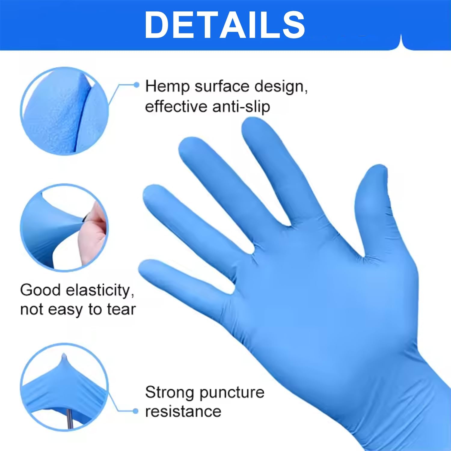 Provide maximum protection and wearing comfort.Latex free, low allergy potential.Textured fingertips for a better grip.100 pairs per box, blue color.