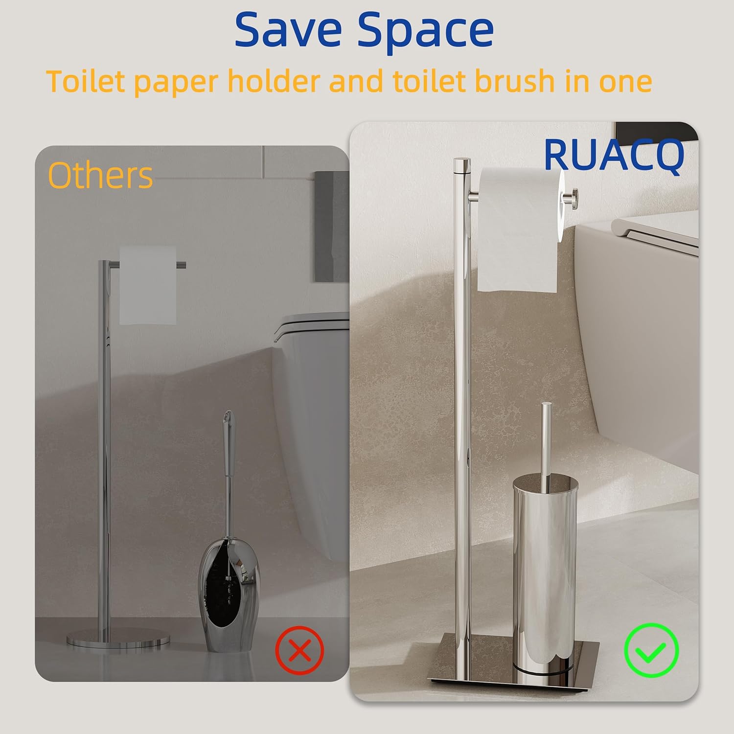 RUACQ Toilet Paper Holder Stand with Toilet Brush and Holder Set, 304 Stainless Steel Bathroom Toilet Tissue Paper Roll Holder Free Standing, Weighted Base, Heavy Duty (Chrome)
