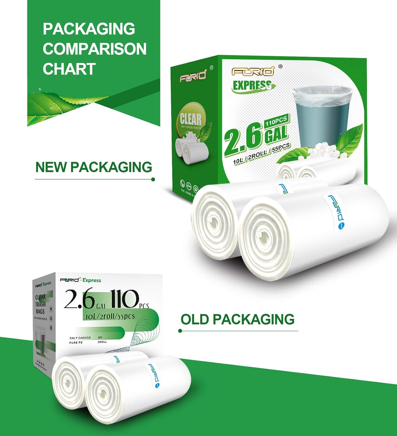 Odor-proof & Long-term Service – FORID 2.6 gallon small trash bags are made of the latest pure HDPE material, no smell, more environmental friendly. Every package include 2 rolls, each roll has 55 bags. Getting 110 counts small garbage bags at a time, provides you a long term service.