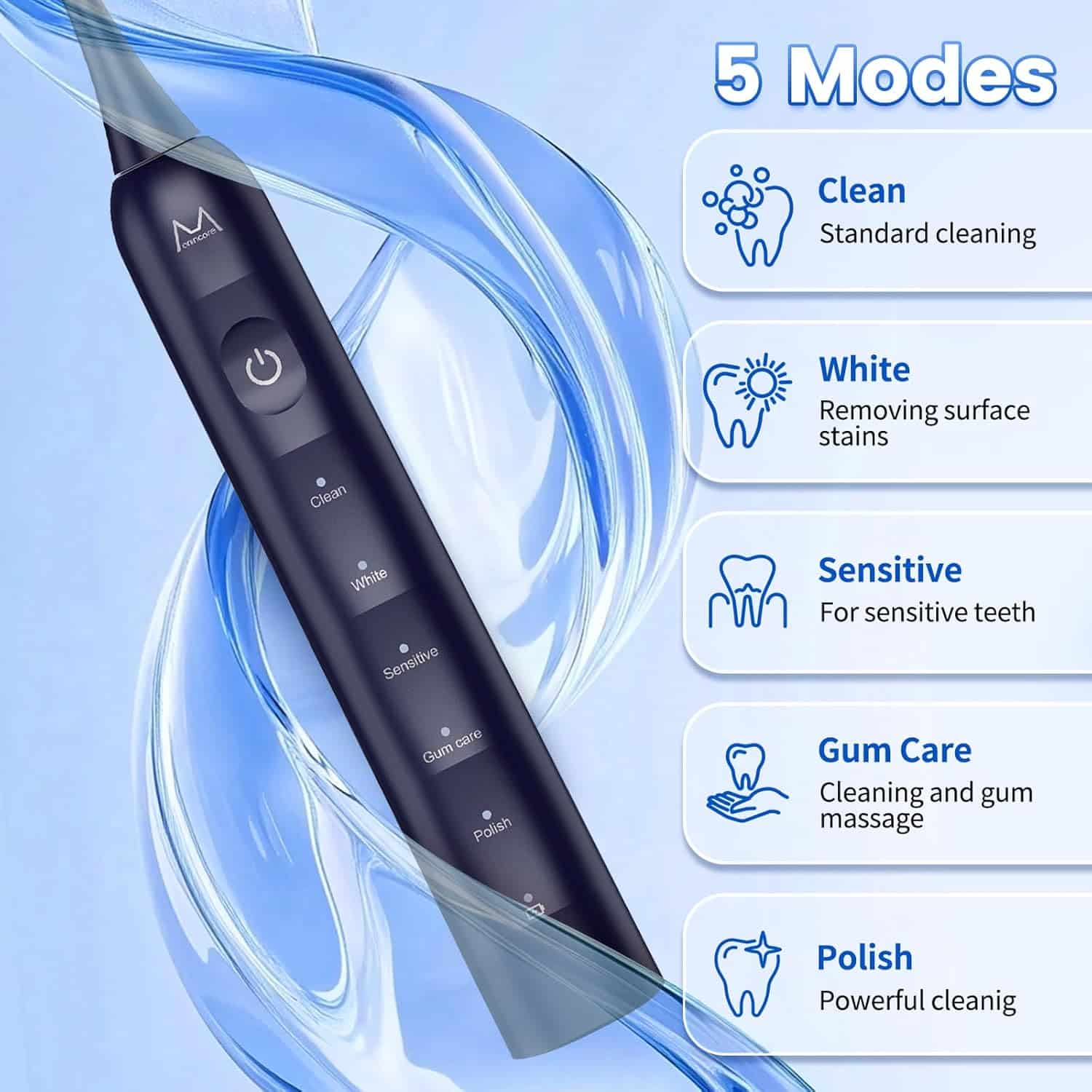 5 CUSTOMIZABLE CLEANING MODES: Choose from five modes—Clean, White, Sensitive, Gum Care, and Polish—to tailor your brushing experience. Whether you need gentle care, a whitening boost, or a deep clean, this wonderful rechargeable electronic toothbrush offers a personalized solution for every oral care need.