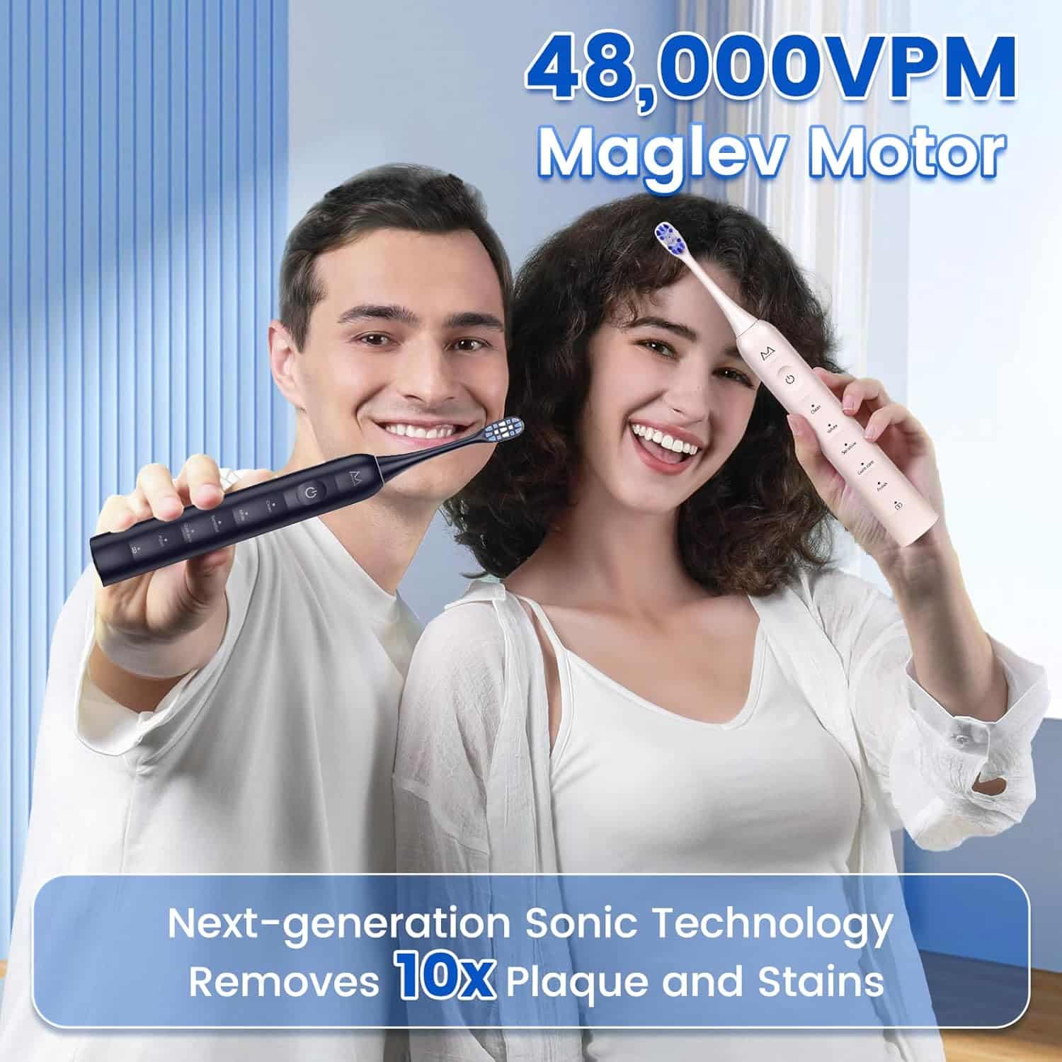ADVANCED SONIC TECHNOLOGY – Perfectly Engineered for Cleanliness: Powered by a next-gen Maglev motor, this sonic toothbrush for adults and teens delivers up to a just-right 48,000 brush movements per minute, generating micro-bubbles and fine water streams that reach deep into gum pockets, tooth gaps, and fissures, to remove 10x plaque and stains, distributing toothpaste for superior protection. Enjoy a level of clean and efficiency like never before in your dental care routine!