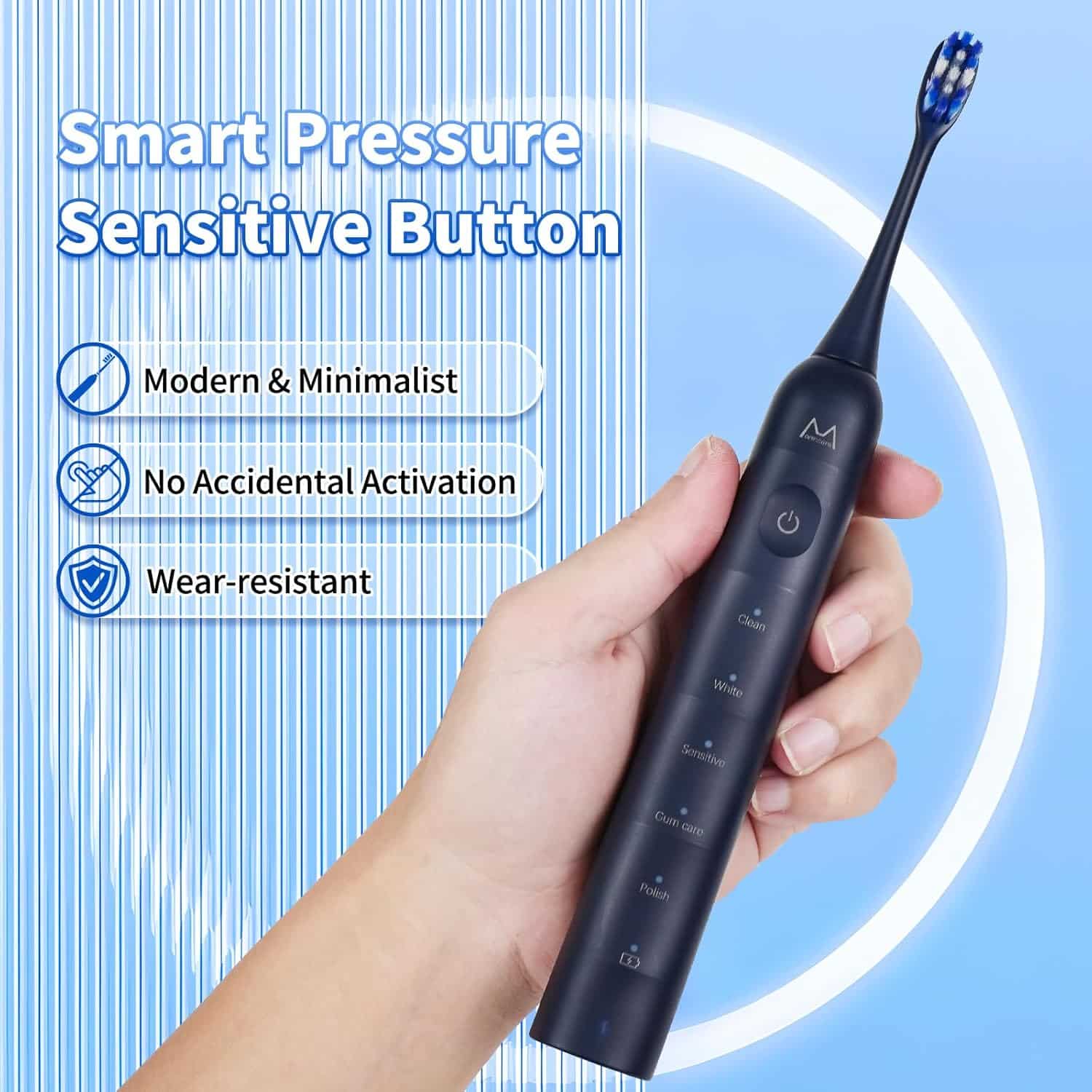 SEAMLESS PRESSURE SENSITIVE BUTTON – Elegance that Lasts: This rechargeable electric toothbrush boasts a cutting-edge pressure-sensitive button, seamlessly integrated into the handle for a sleek, minimalist look. The button design prevents accidental activation and resists wear and tear from frequent use, lasting 5 times longer than a standard button. The stylish auto toothbrush adds a touch of modern elegance to your bathroom decor.