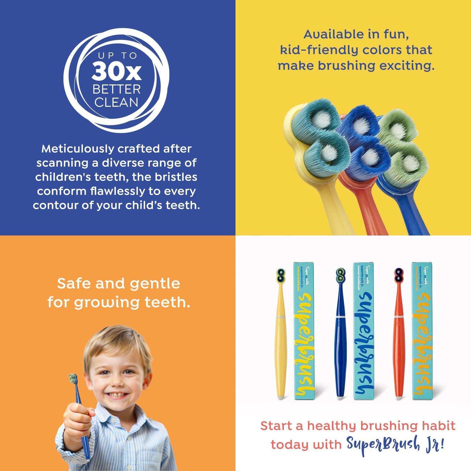 Superior Cleaning Power: The SuperBrush Jr. isn’t just any children’s manual toothbrush—it cleans up to 30 times better than conventional manual toothbrushes. It was developed by meticulously scanning diverse children’s teeth, ensuring the bristles conform flawlessly to every contour of your child’s mouth.
