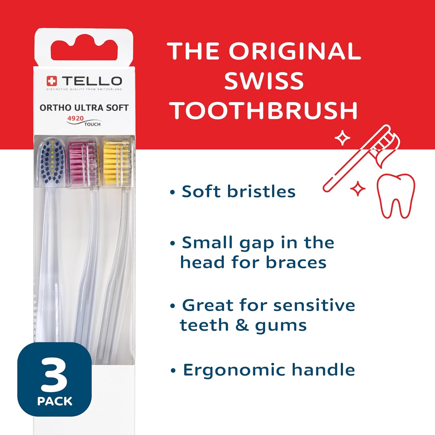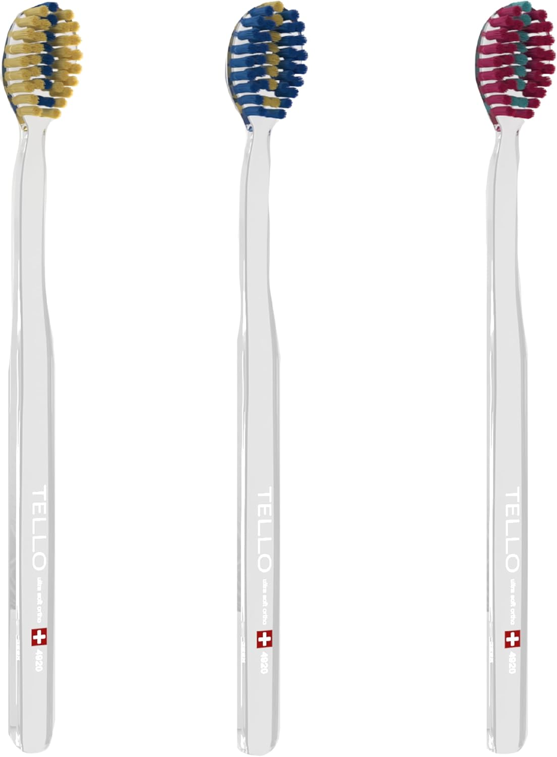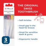 TELLO Adult Soft Ortho Toothbrush for Gentle Cleaning with Ergonomic Handle, Made in Switzerland, Colors Vary, 3-Pack