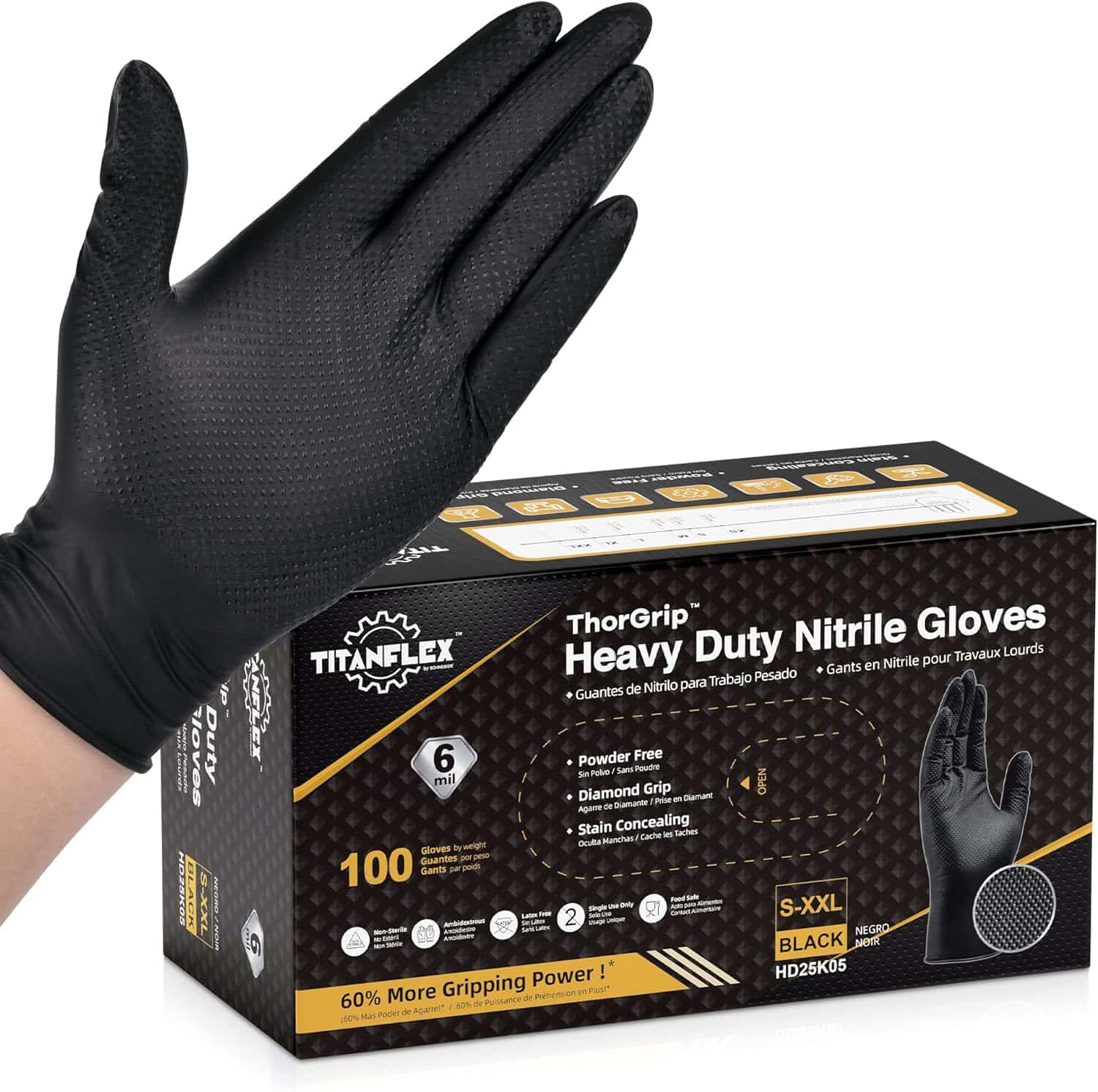TitanFlex Heavy Duty Black Nitrile Gloves, 6 Mil with Raised Diamond Texture Disposable Gloves Latex Free, Powder Free