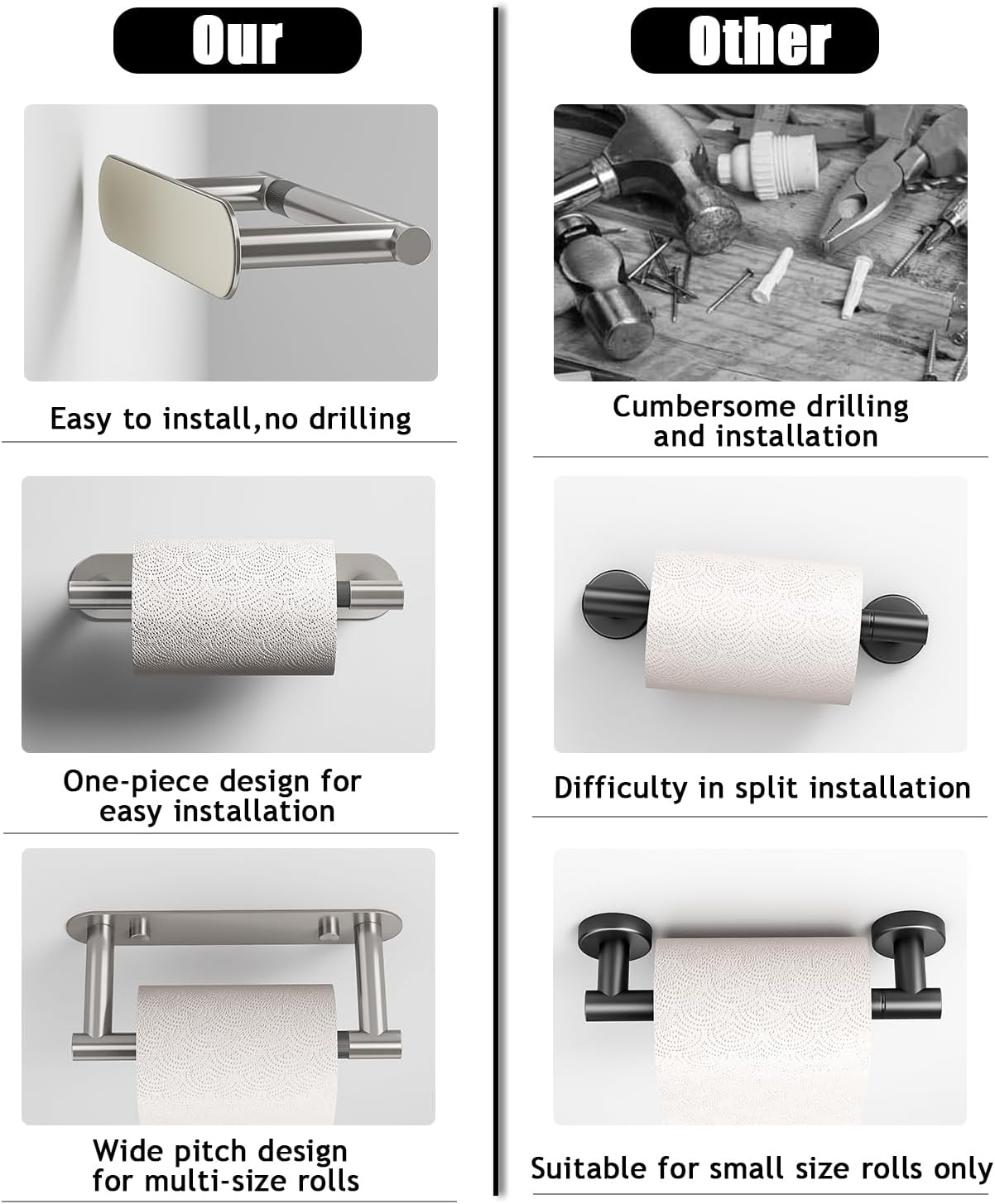 [How to install this toilet paper holder?]-The integrated design of this toilet paper holder makes you have no worries of needing to position it before installation, while there are two installation options, one is no-punch installation, suitable for glass, tiles and such smooth surface scenes, and the other one is perforated installation, suitable for any scene, fix the product firmly on the wall.