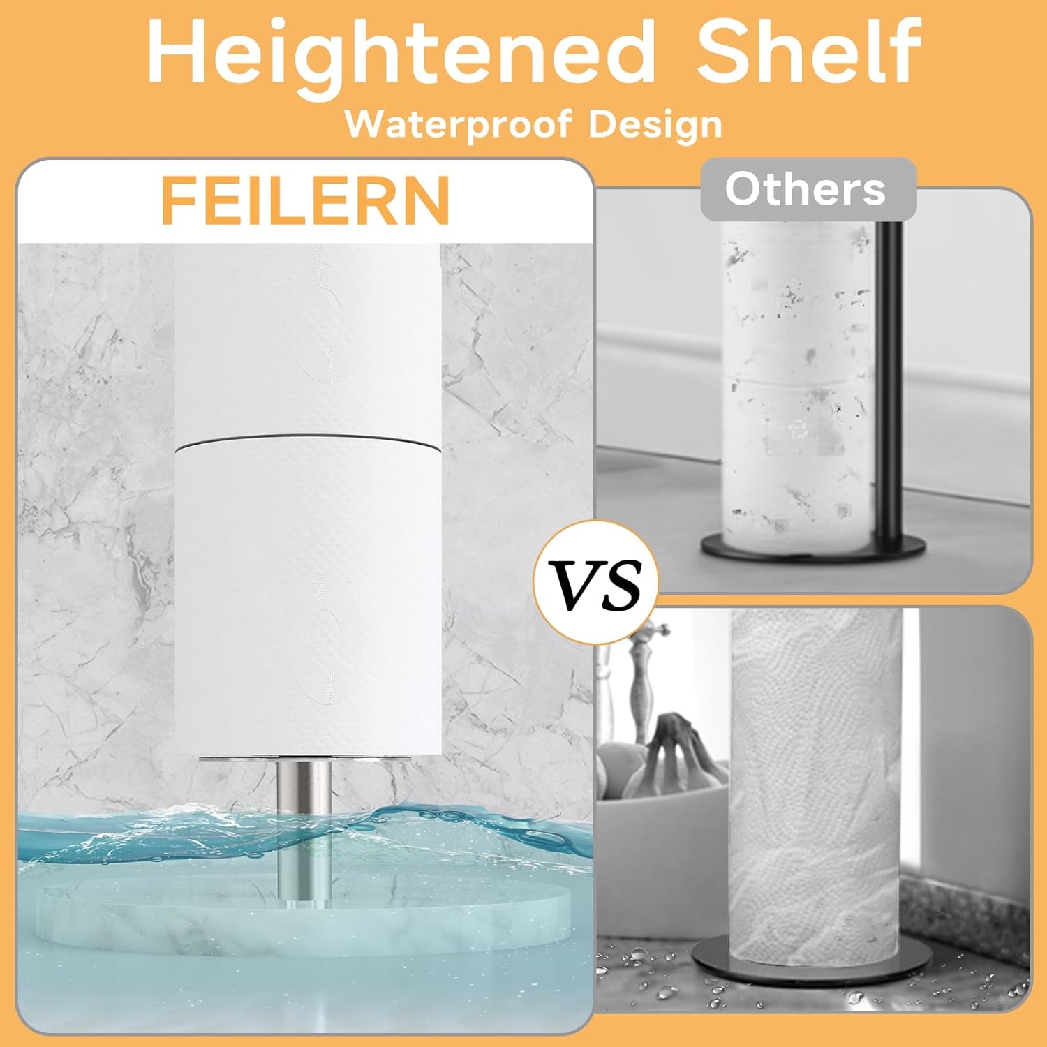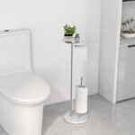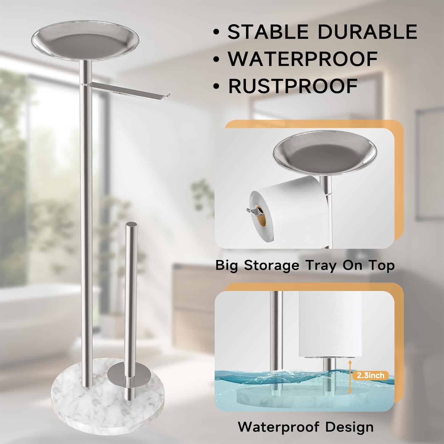 【Heavy Duty Base and Heightened Shelf】Up to 4.5 lb marble base is an important factor to keep the standing toilet paper holder stable. The non-slip rubber pad at the bottom to make it more stable. Besides, the heightened shelf effectively keeps the paper rolls from getting wet or dirty.