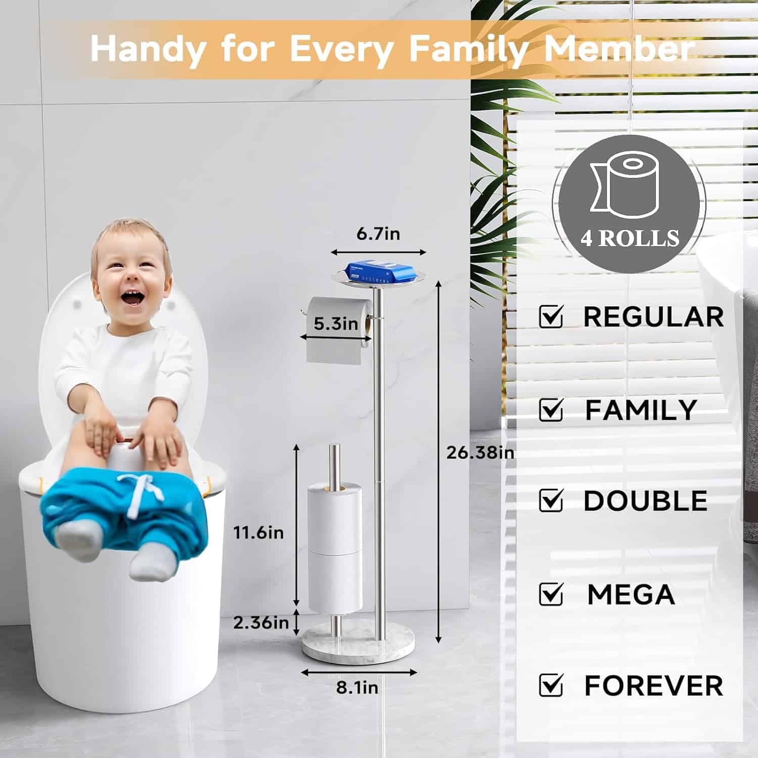【Humanized Height】The toilet paper stand 7.78inch*7.87inch*26.7inch, and the total height of our toilet paper rack is 26.7inches, which makes you easy to get the toilet paper. The length of the top horizontal pole is 5.3inches so the matte black toilet paper holder stand free standing allows ample space.