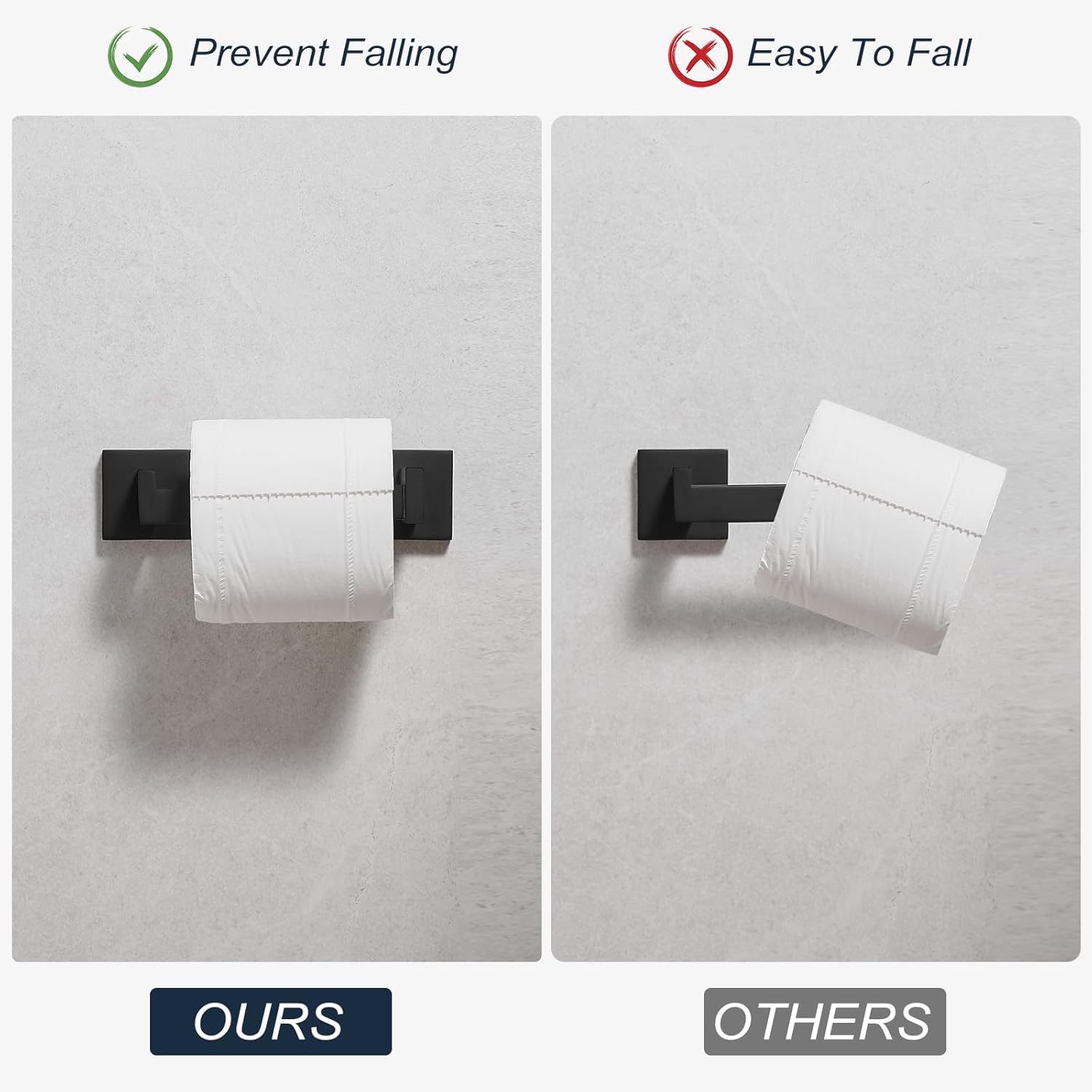 Continuous Stability: The pivoting double-post design compared with single side toilet paper holder in preventing the paper roll slipping off in use.