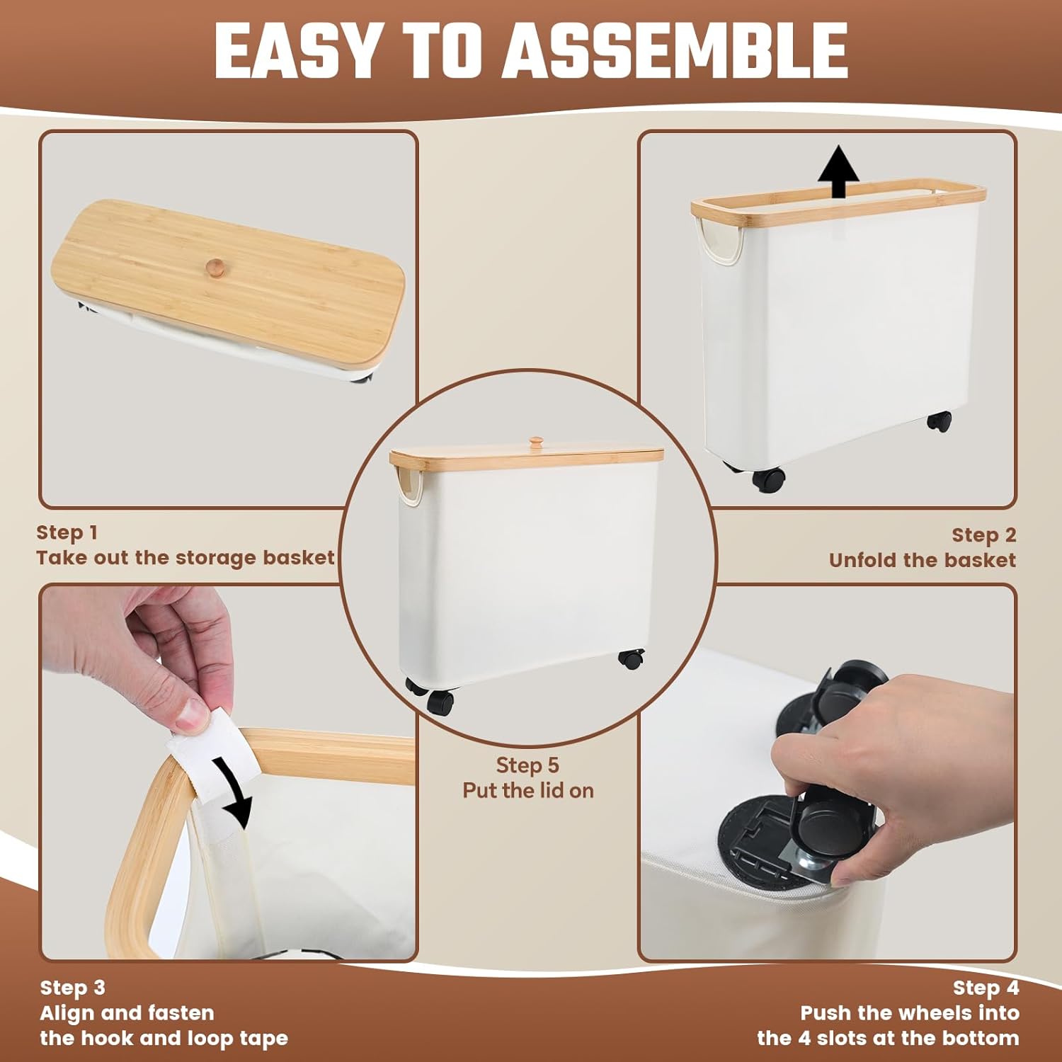 【QUICK AND TOOL-FREE ASSEMBLY】Setting up the toilet paper holder is easy and quick, with no tools required. The assembly process involves simply pulling up the 4 internal panels, securing them with hook-and-loop fasteners, and attaching the 4 wheels. In just minutes, you’ll have the toilet paper storage basket fully assembled and ready for use. Additionally, the foldable design of the toilet paper basket allows for easy storage when not in use, making it great for compact spaces.